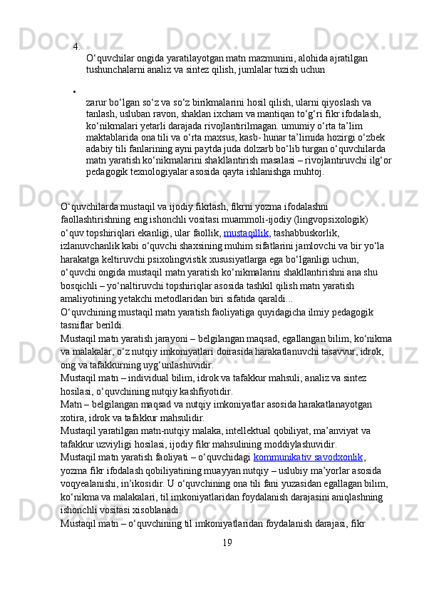 I – BOB. 4-SINF O’QUVCHILARIDA MATN YARATISHNI SHAKLLANTIRISH