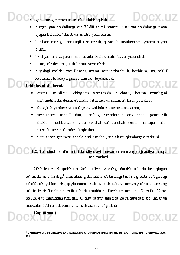 1.2. To‘rtinchi sinf ona tili darsligidagi mavzular va ularga ajratilgan vaqt me’yorlari 10