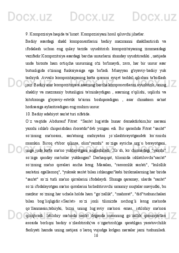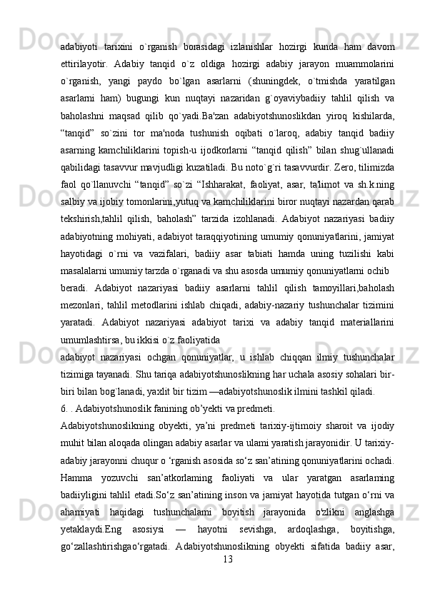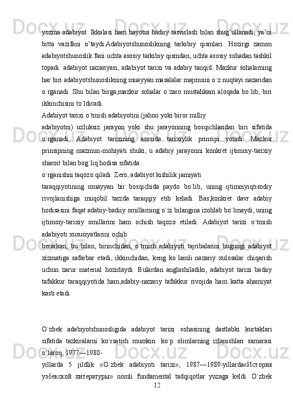 1.1 Adabiyotshunoslikning tarkibiy qismlari .………………………….……..7-12