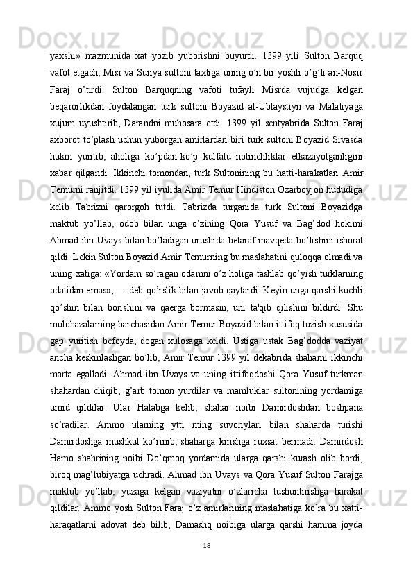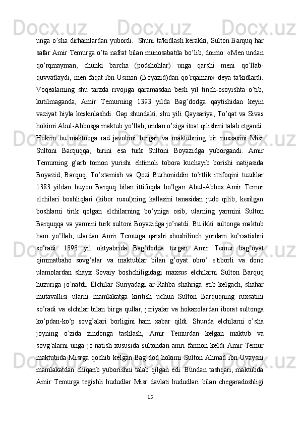 Barquqqa va yarmini turk sultoni Boyazidga jo’natdi. Bu ikki sultonga maktub
