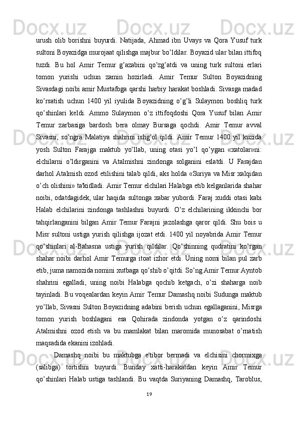 tuzdi.   Bu   hol   Amir   Tеmur   g’azabini   qo’zg’atdi   va   uning   turk   sultoni   еrlari