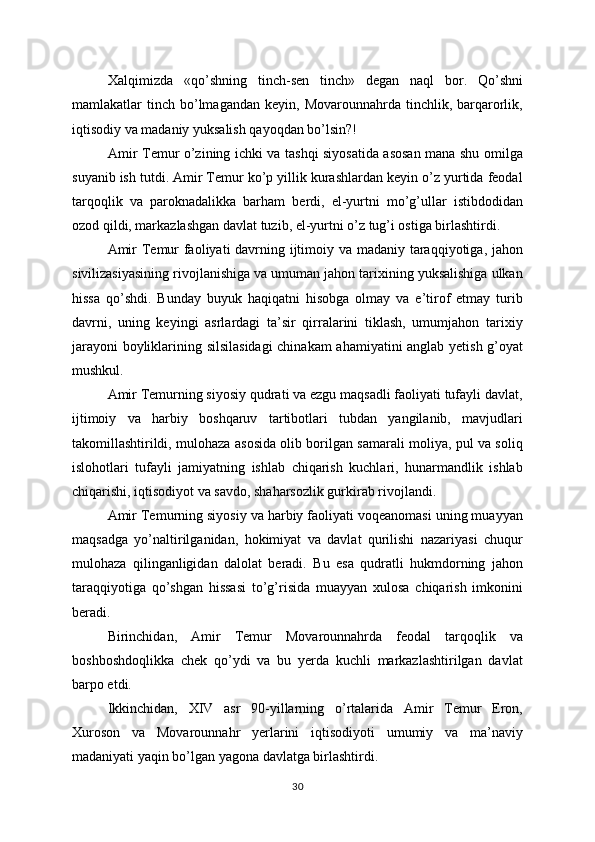 ildamlashtirdi. Xazina to’la   boshladi. Amir Tеmur imkon qadar ichki savdoga