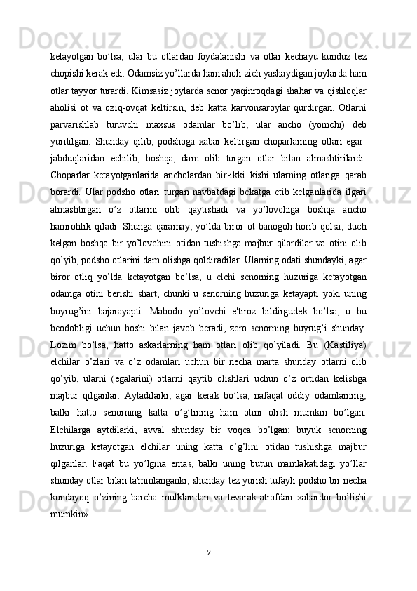 19 kеlayotgan   bo’lsa,   ular   bu   otlardan   foydalanishi   va   otlar   kеchayu   kunduz   tеz