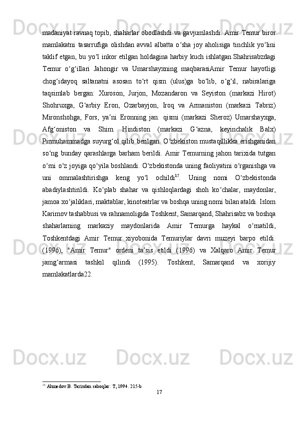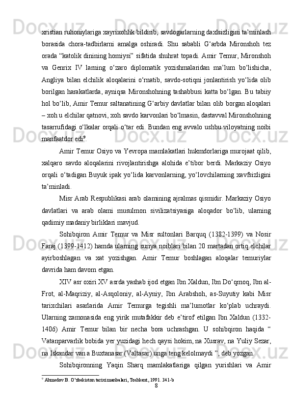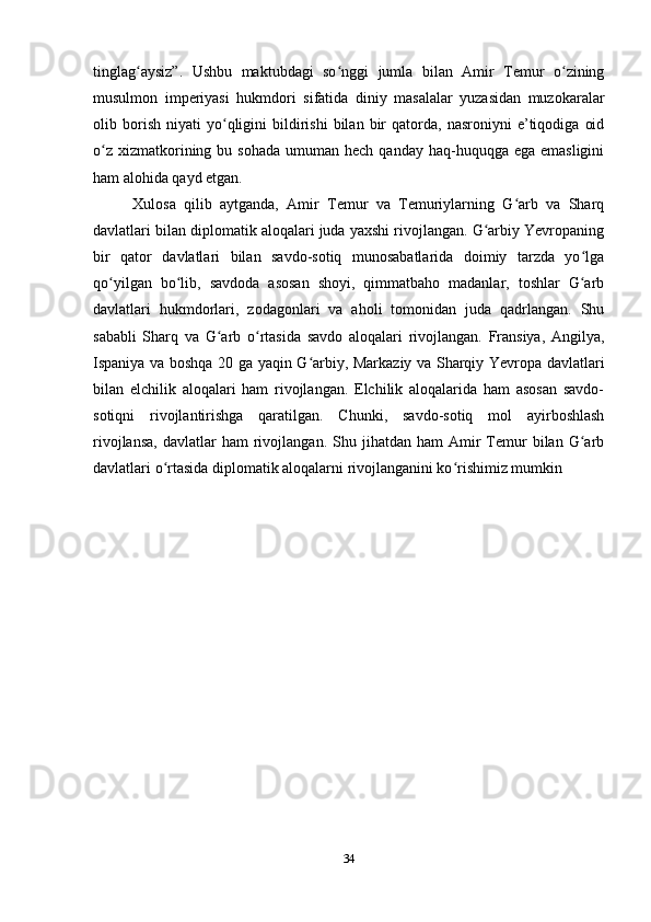 1.2. Temuriylarning gʻarb davlatlari bilan siyosiy diplomatik munosabatlari…………………………………………………………………..….12