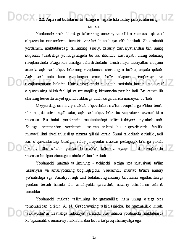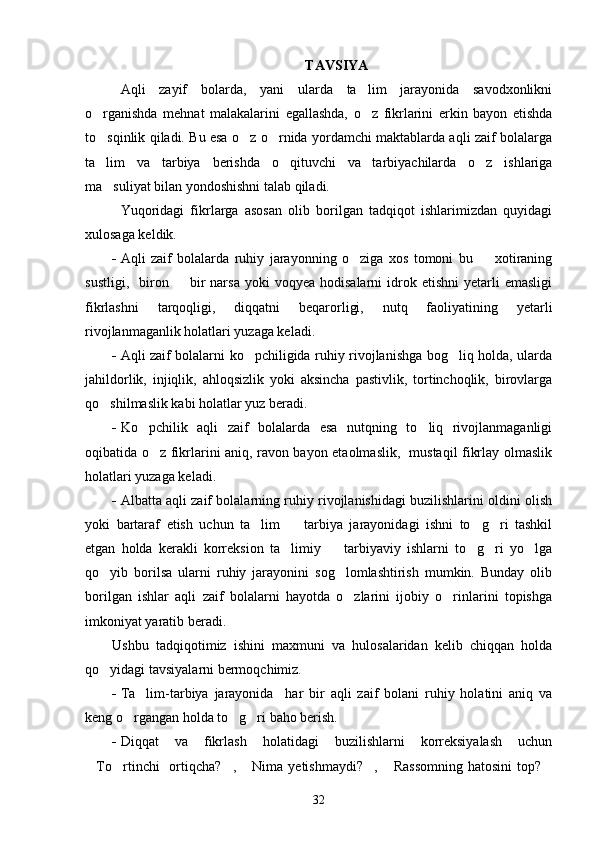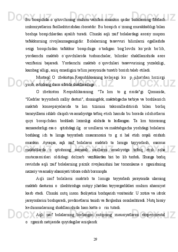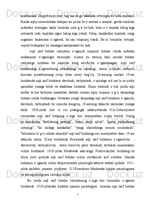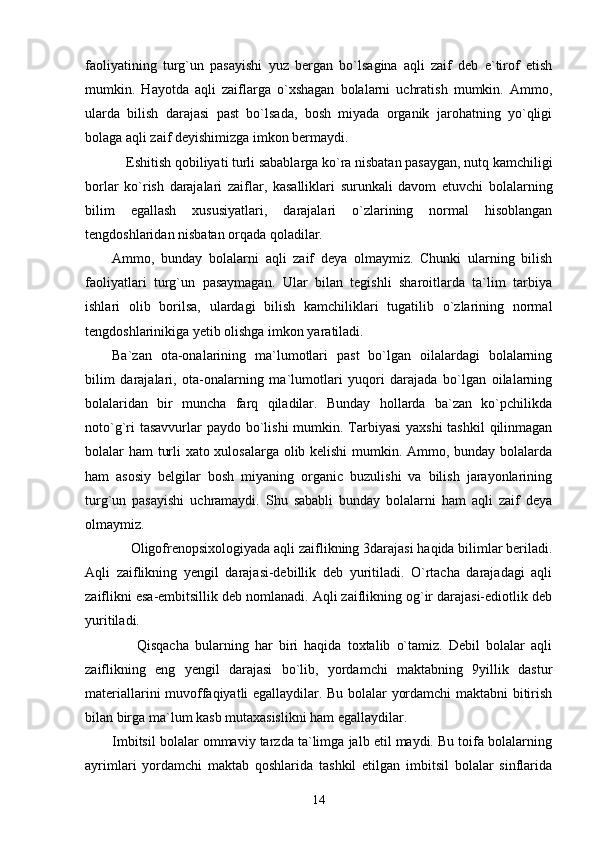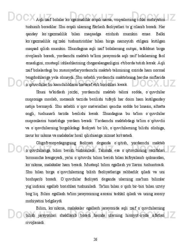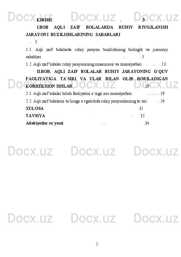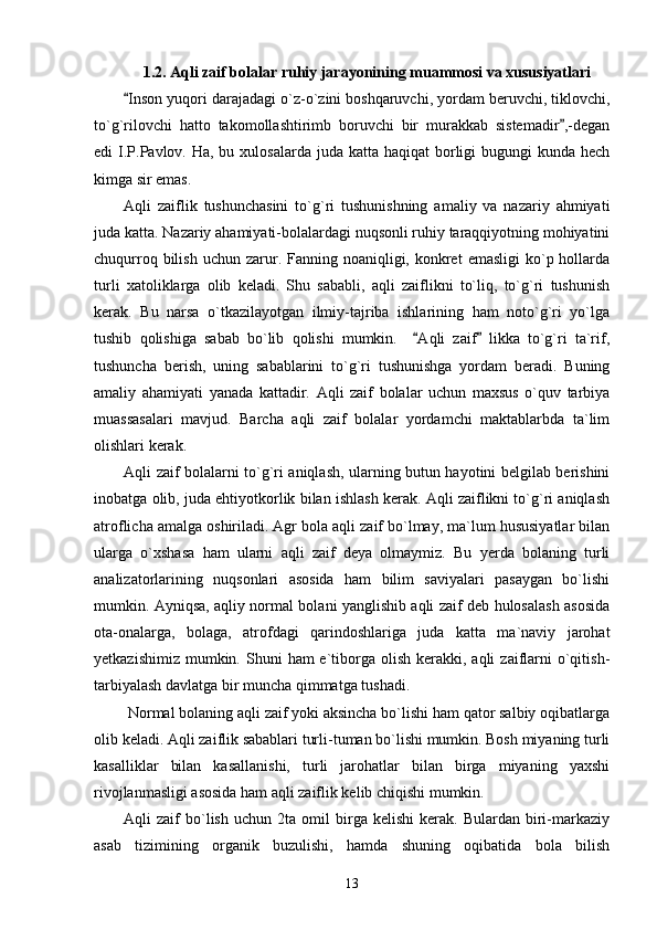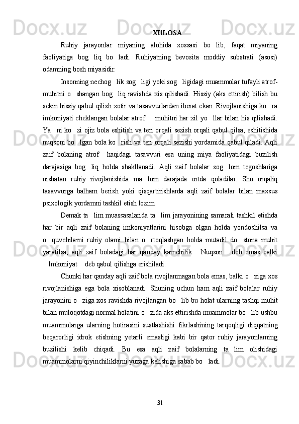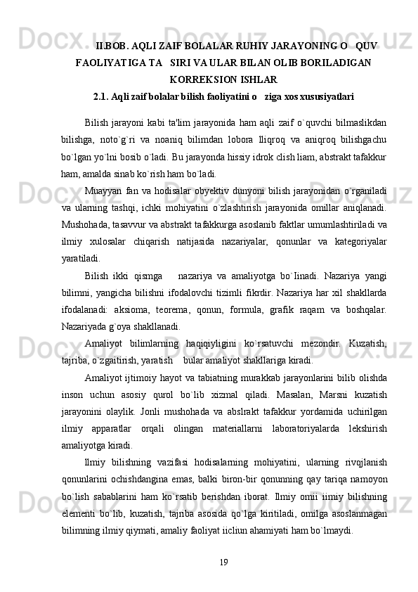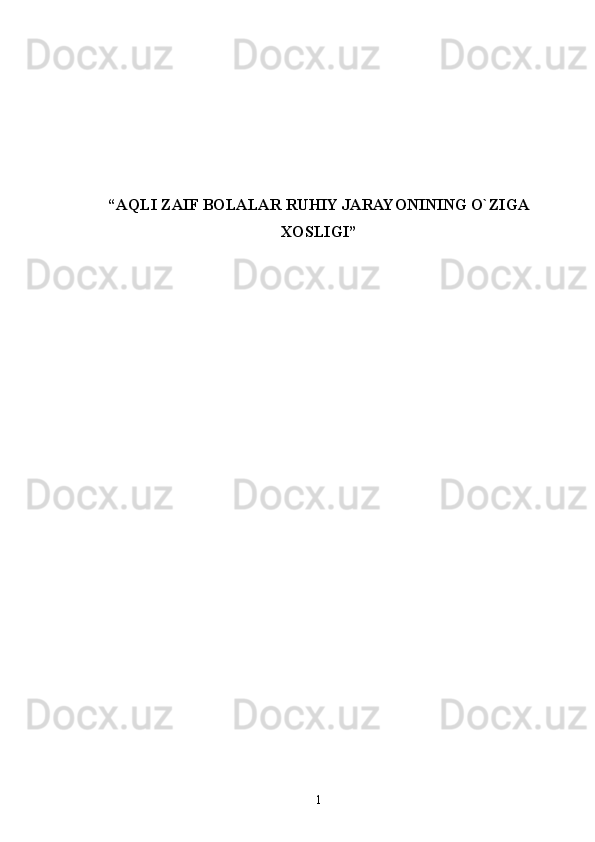 Aqli zaif bolalar ruhiy jarayonining o’ziga xosligi AQLI ZAIF BOLALARDA RUHIY RIVOJLANISH JARAYONI BUZILISHLARINING SABABLARI Aqli zaif bolalarda ruhiy jarayon buzilishining biologik va jismoniy sabablari Aqli zaif bolalar ruhiy jarayonining muammosi va xususiyatlari AQLI ZAIF BOLALAR RUHIY JARAYONING O`QUV FAOLIYATIGA TA`SIRI VA ULAR BILAN OLIB BORILADIGAN KORREKSION ISHLAR Aqli zaif bolalar bilish faoliyatini o`ziga xos xususiyatlari Aqli zaif bolalarni ta`limga o`rgatishda ruhiy jarayonlarning ta`siri