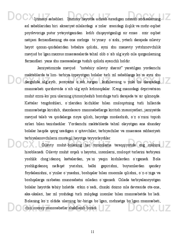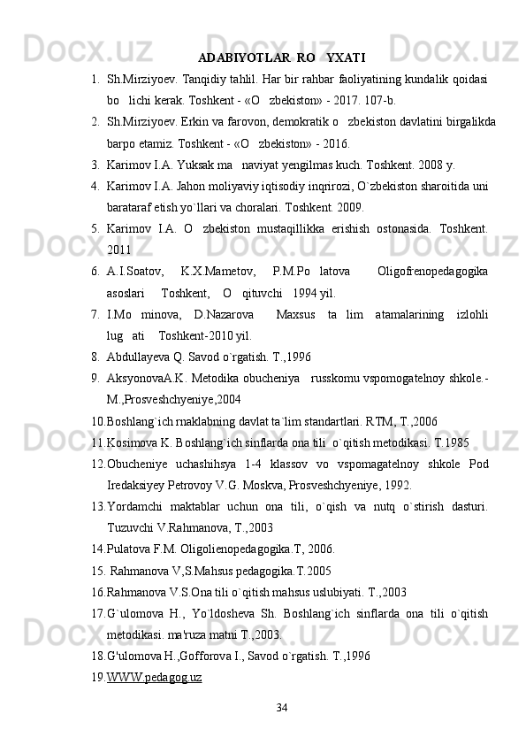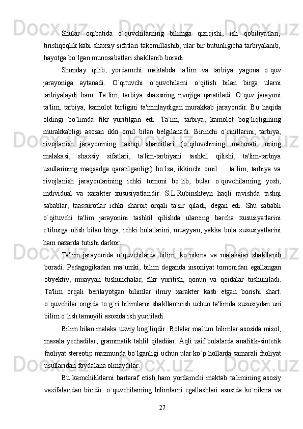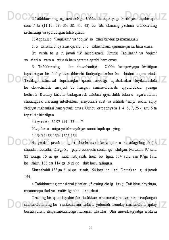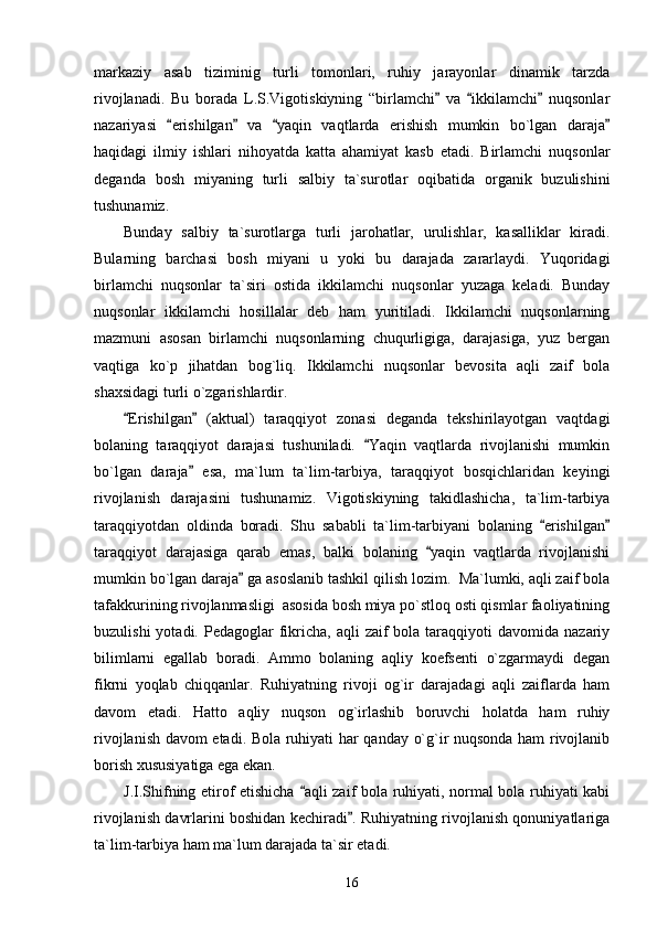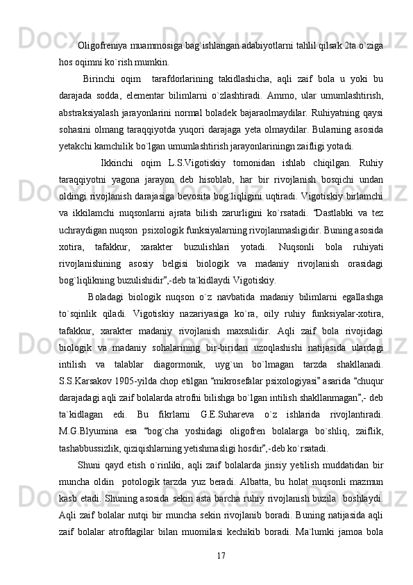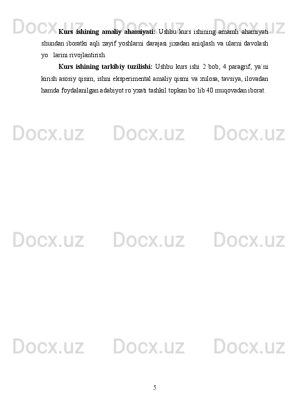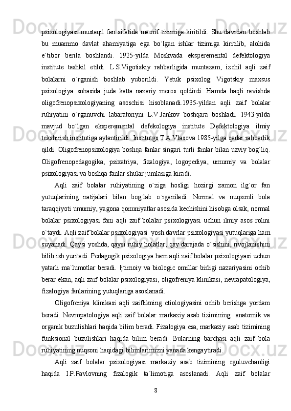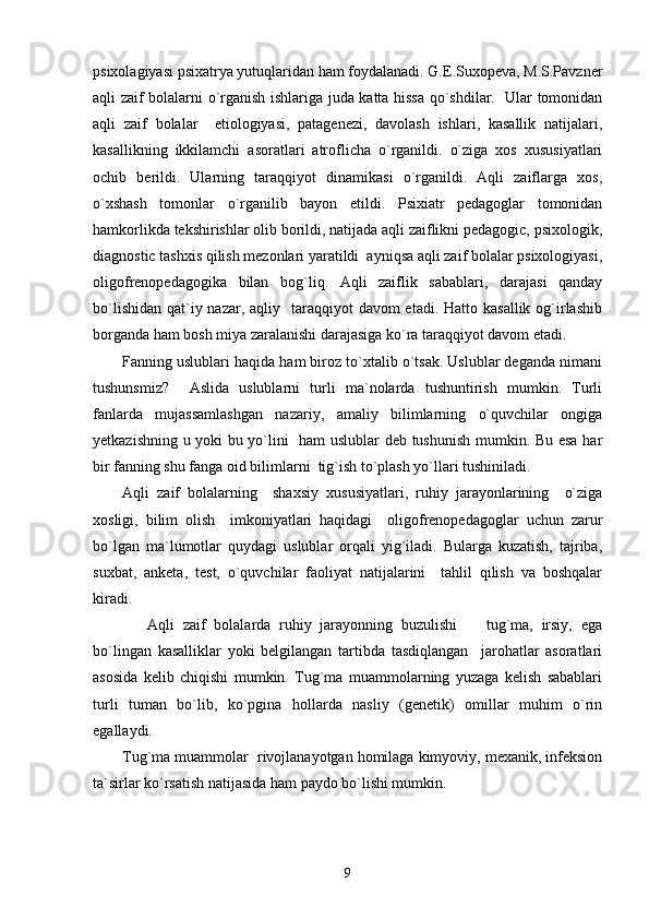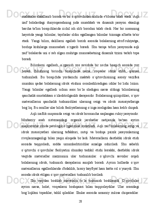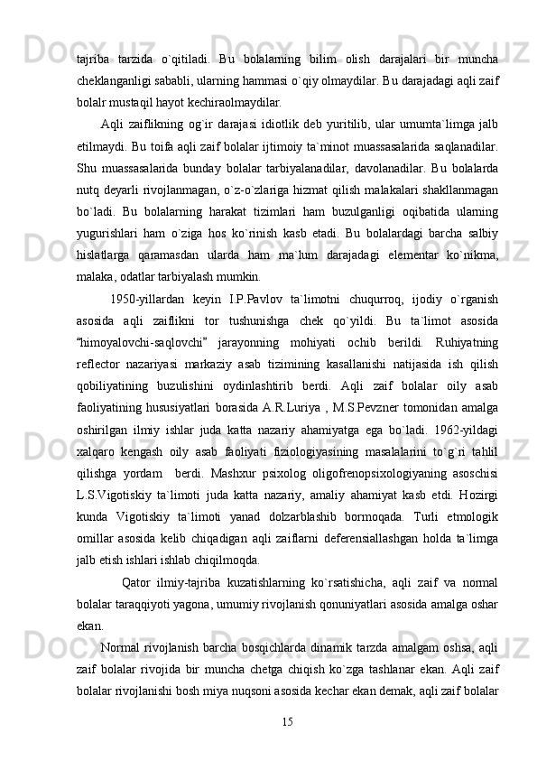 Aqli zaif bolalar ruhiy jarayonining o’ziga xosligi AQLI ZAIF BOLALARDA RUHIY RIVOJLANISH JARAYONI BUZILISHLARINING SABABLARI Aqli zaif bolalarda ruhiy jarayon buzilishining biologik va jismoniy sabablari Aqli zaif bolalar ruhiy jarayonining muammosi va xususiyatlari AQLI ZAIF BOLALAR RUHIY JARAYONING O`QUV FAOLIYATIGA TA`SIRI VA ULAR BILAN OLIB BORILADIGAN KORREKSION ISHLAR Aqli zaif bolalar bilish faoliyatini o`ziga xos xususiyatlari Aqli zaif bolalarni ta`limga o`rgatishda ruhiy jarayonlarning ta`siri
