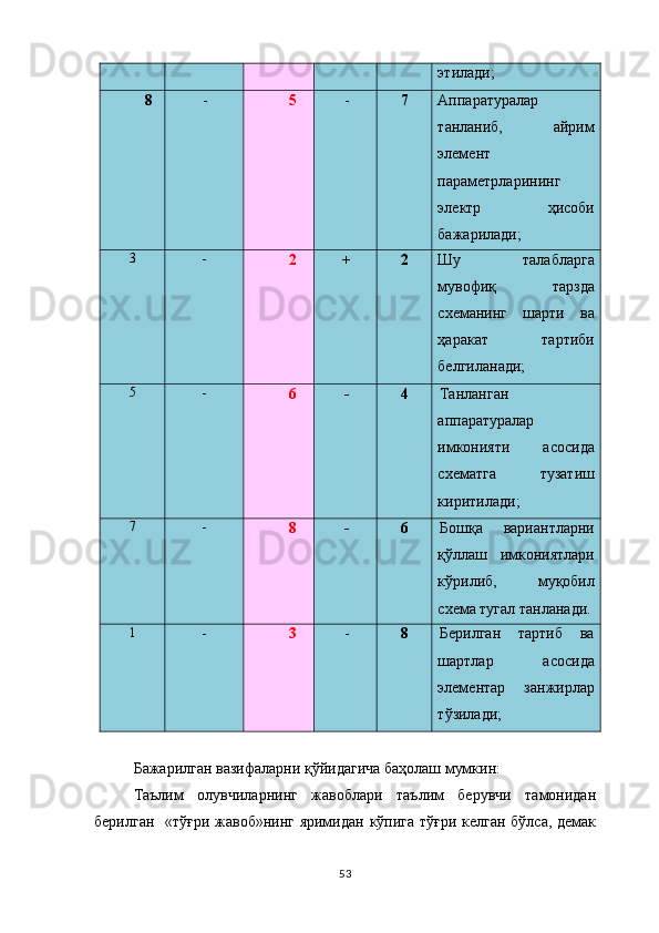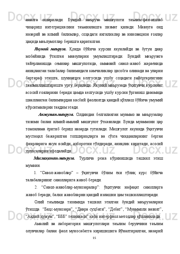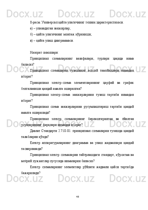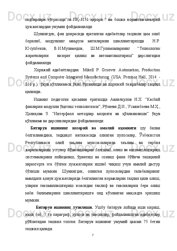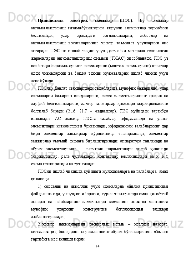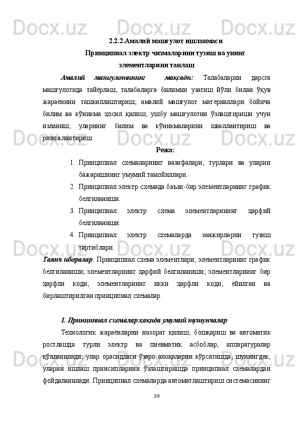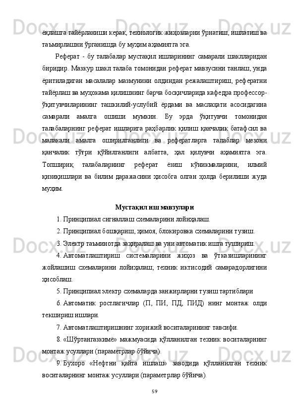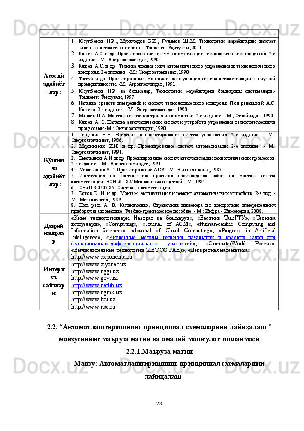 | 2.2 | “Автоматлаштиришнинг принципиал схемаларини лойиҳалаш” мавзусининг маъруза матни ва амалий машғулот ишланмаси............................................................. |