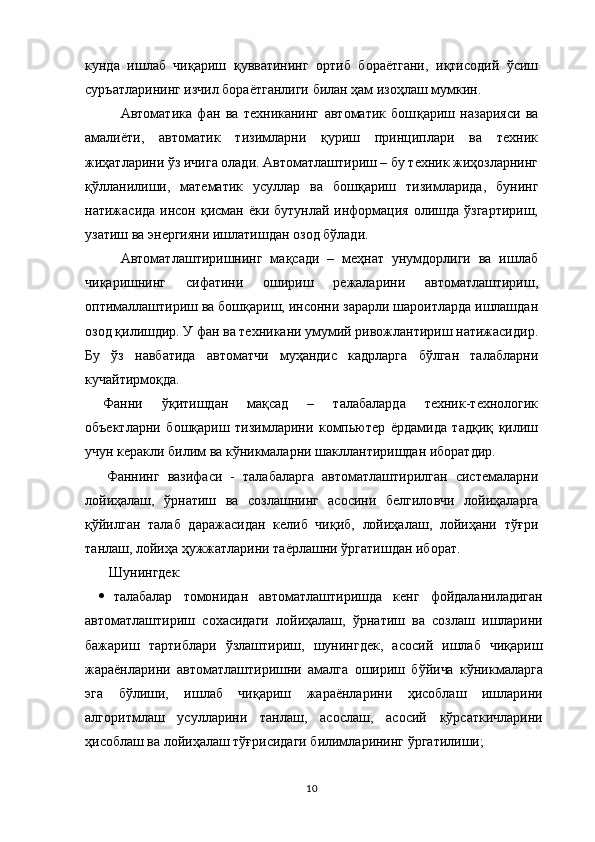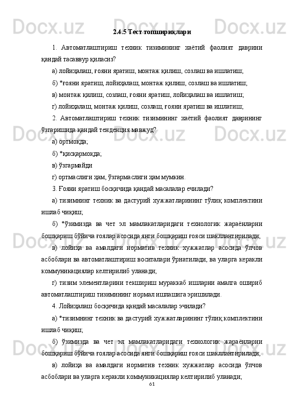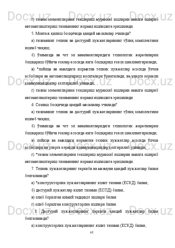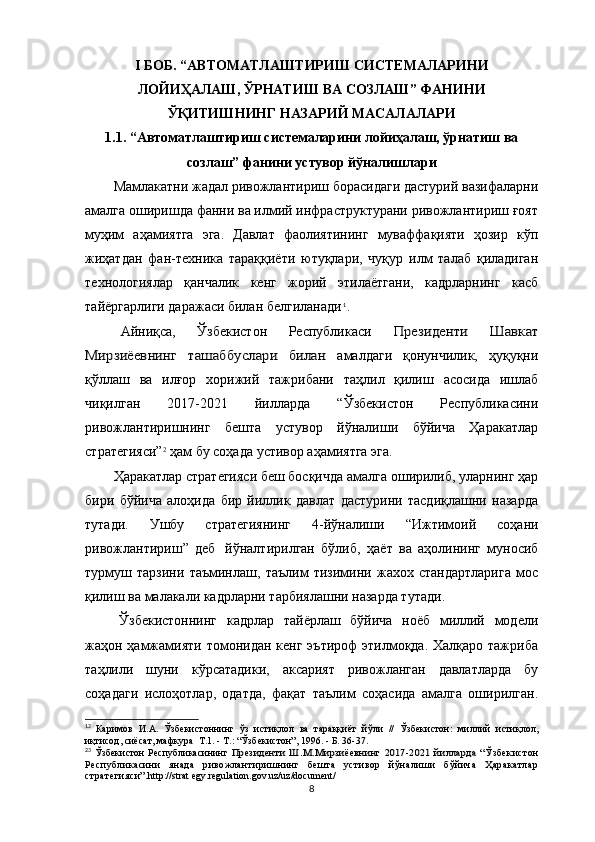| I-БОБ | “АВТОМАТЛАШТИРИШ СИСТЕМАЛАРИНИ ЛОЙИҲАЛАШ, ЎРНАТИШ ВА СОЗЛАШ” ФАНИНИ ЎҚИТИШНИНГ НАЗАРИЙ МАСАЛАЛАРИ................. |