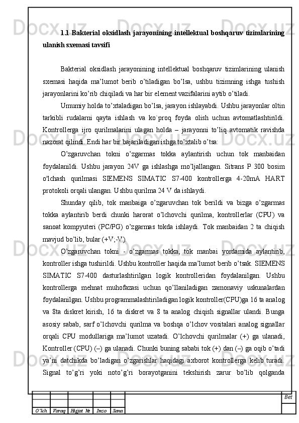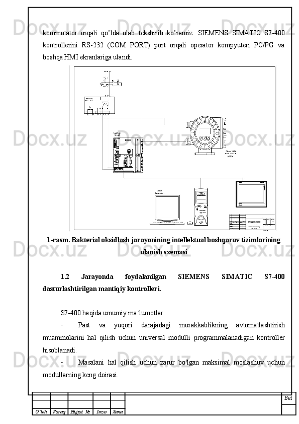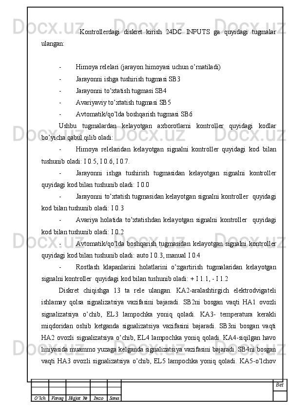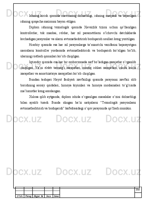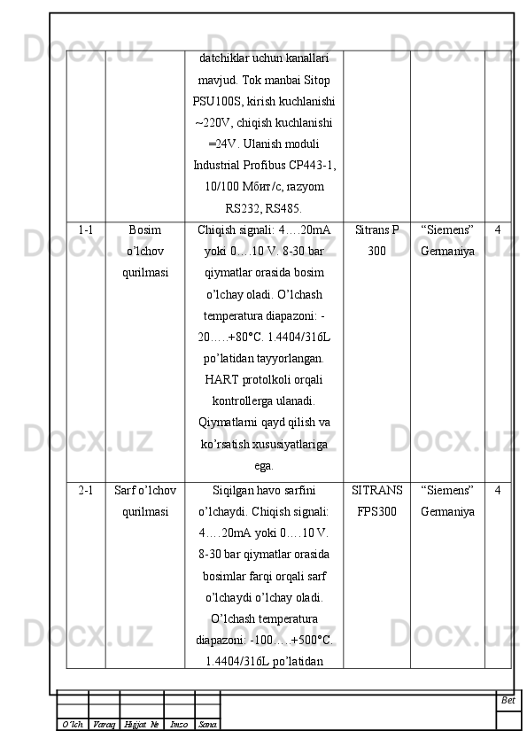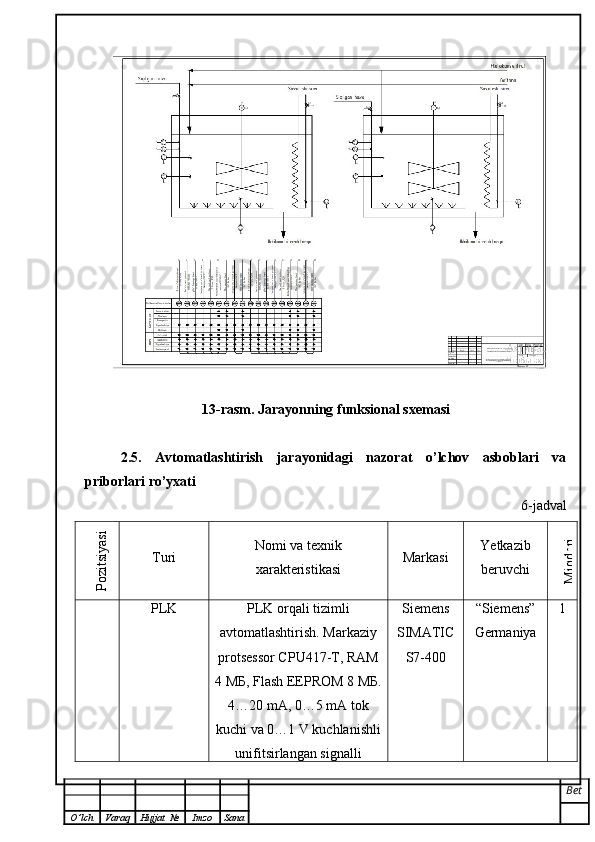 2.5 Avtomatlashtirish jarayonidagi nazorat o’lchov asboblari va qurilmalari ro’yhati………………………………………………………………………...