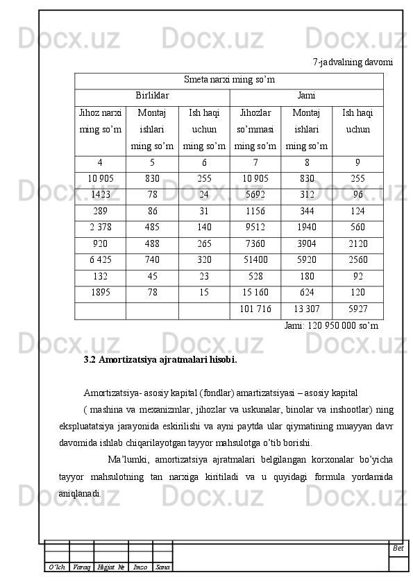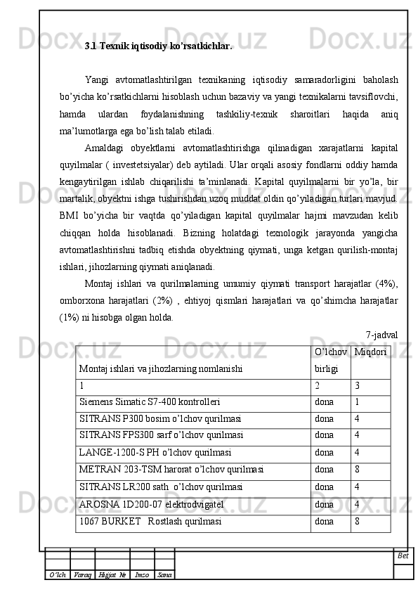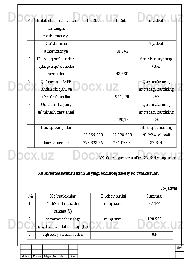 3.8 Avtomatlashtirishdan keyingi texnik iqtisodiy ko’rsatkichlar…………………