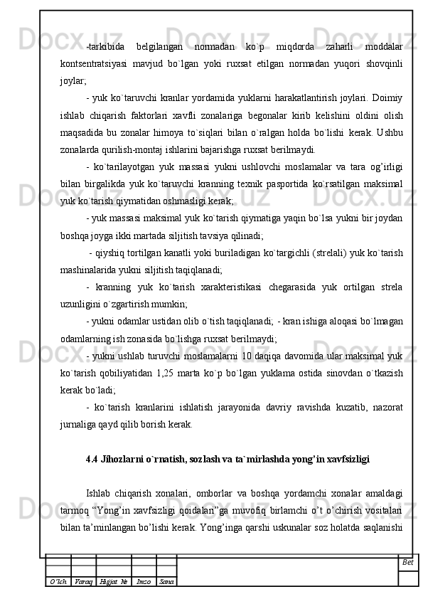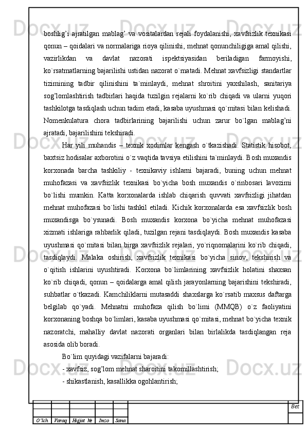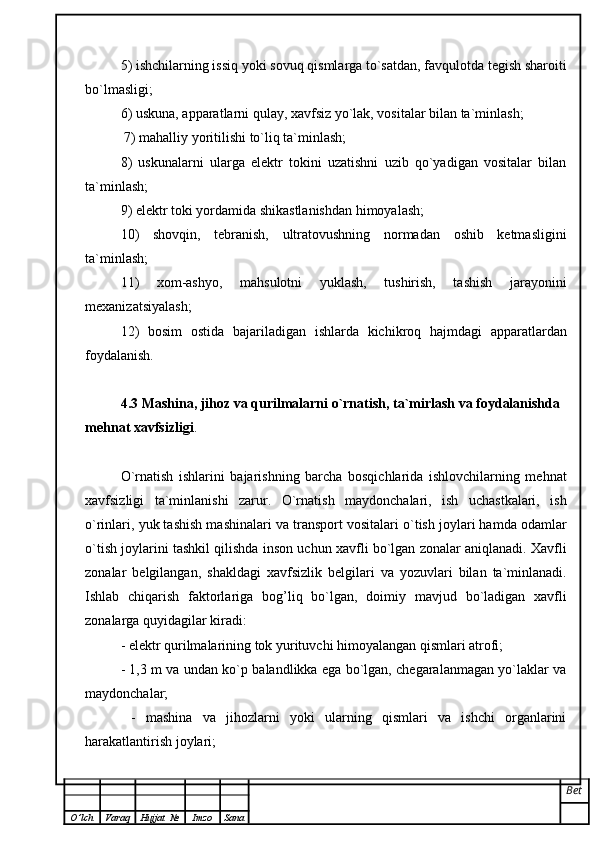 4.3 Mashina, jihoz va qurilmalarni o`rnatish, ta`mirlash va foydalanishda mehnat xavfsizligi.......................................................................………………………