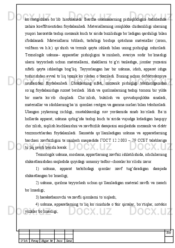 4.2 Texnologik uskuna, moslama, qurilma-apparatlarining xavfsizligi……………