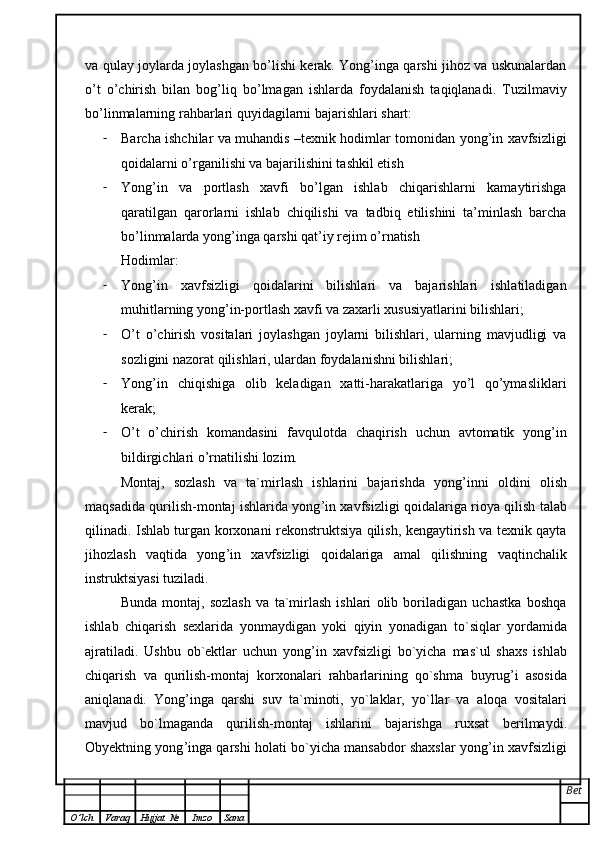 4.4 Jihozlarni o`rnatish, sozlash va ta`mirlashda yong’in xavfsizligi …………….