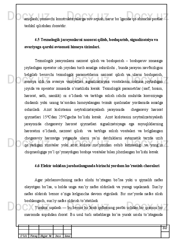 4.5 Texnologik jarayonlarni nazorat qilish, boshqarish, signalizatsiya va avariyaga qarshi avtomati himoya tizimlari……………………………………