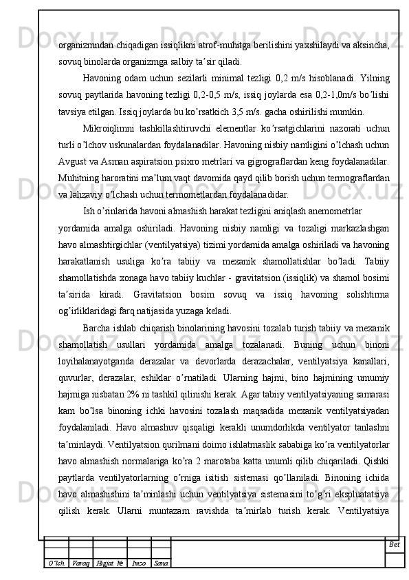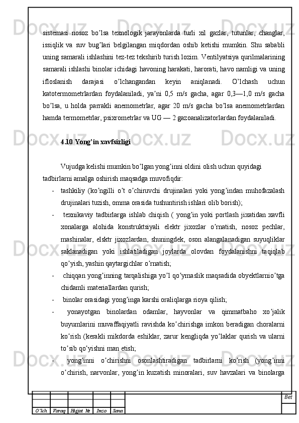 4.9 Ishlab chiqarish korxonalarida shamollatish tizimi …………………………..