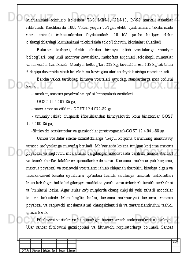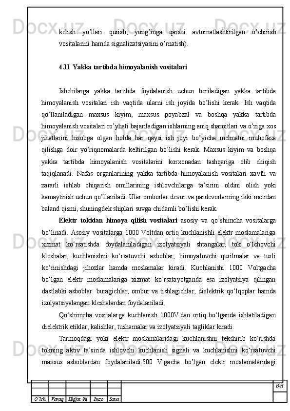 4.11 Yakka tartibda himoyalash vositalari..............................................................