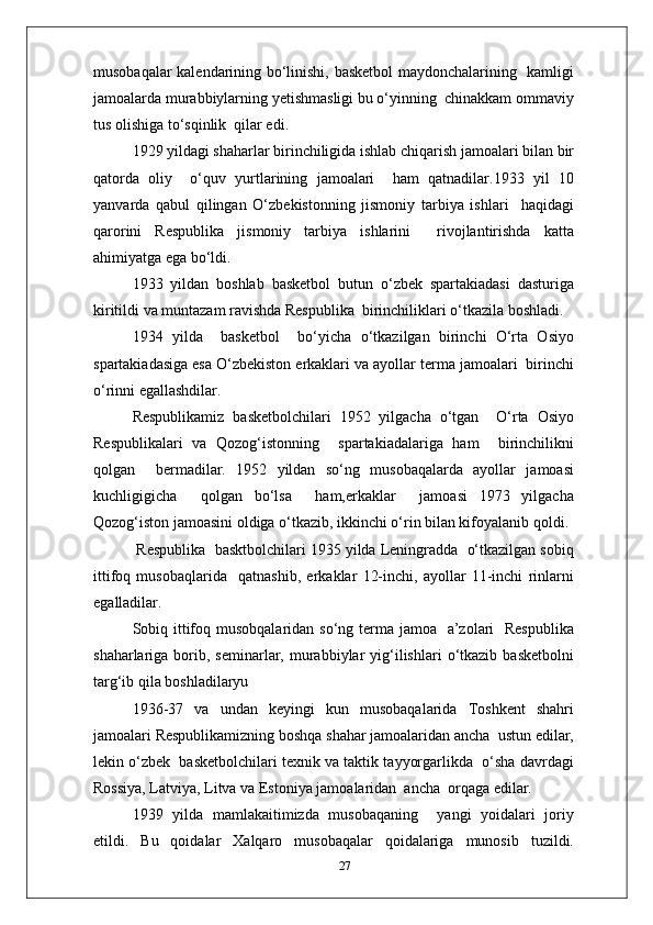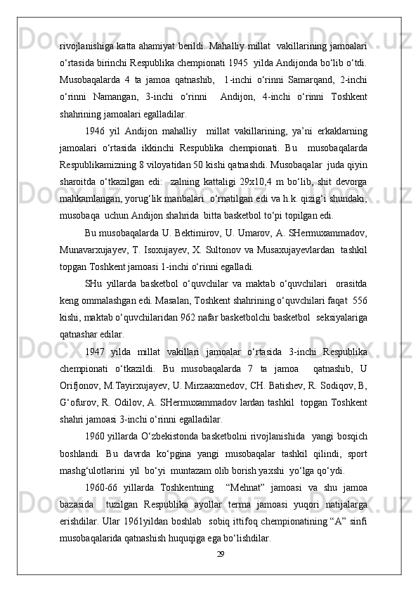 Basketbol o’yinini O’zbekistonda rivojlanishi.