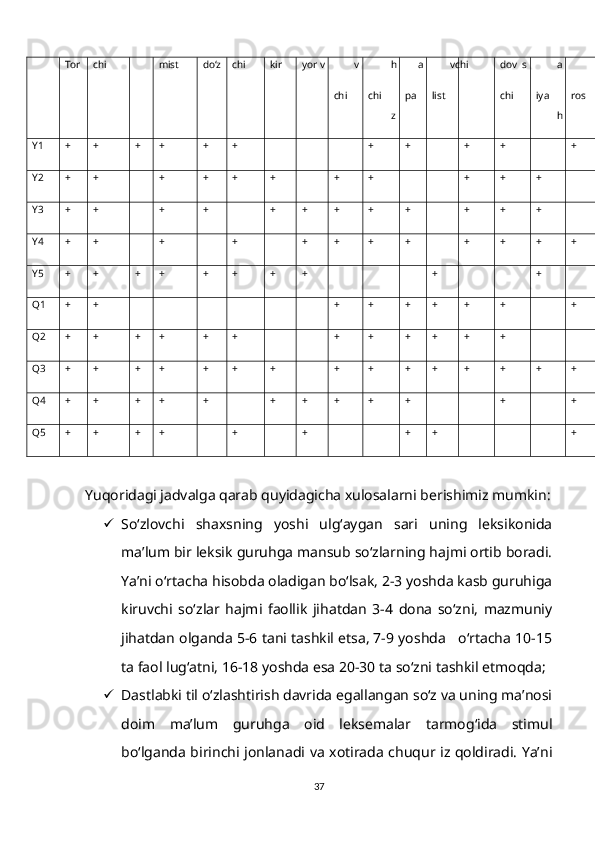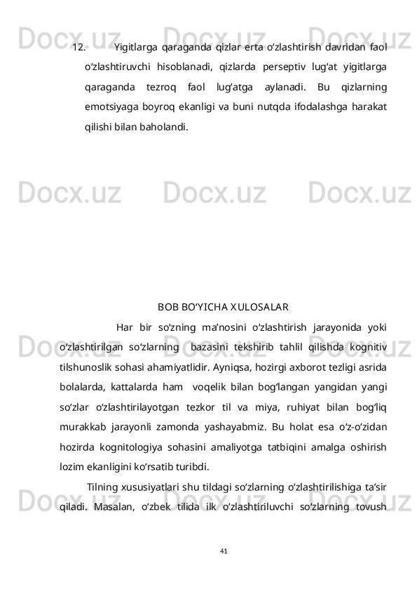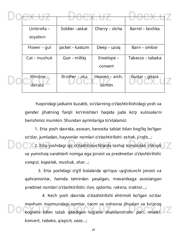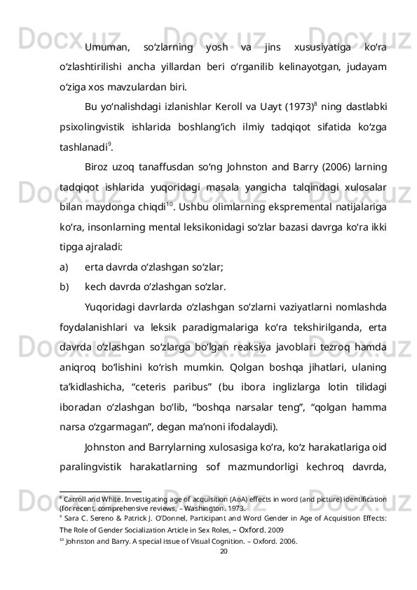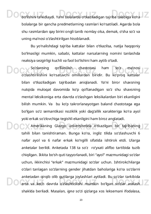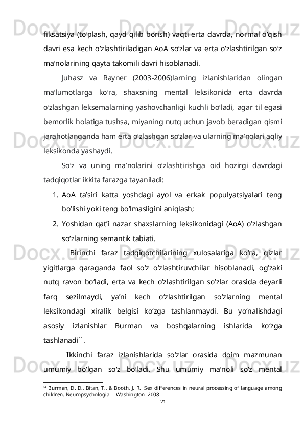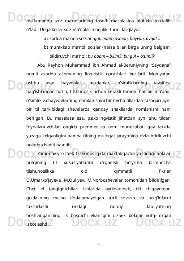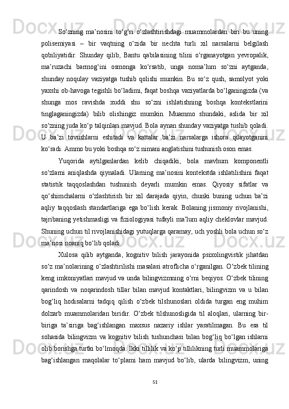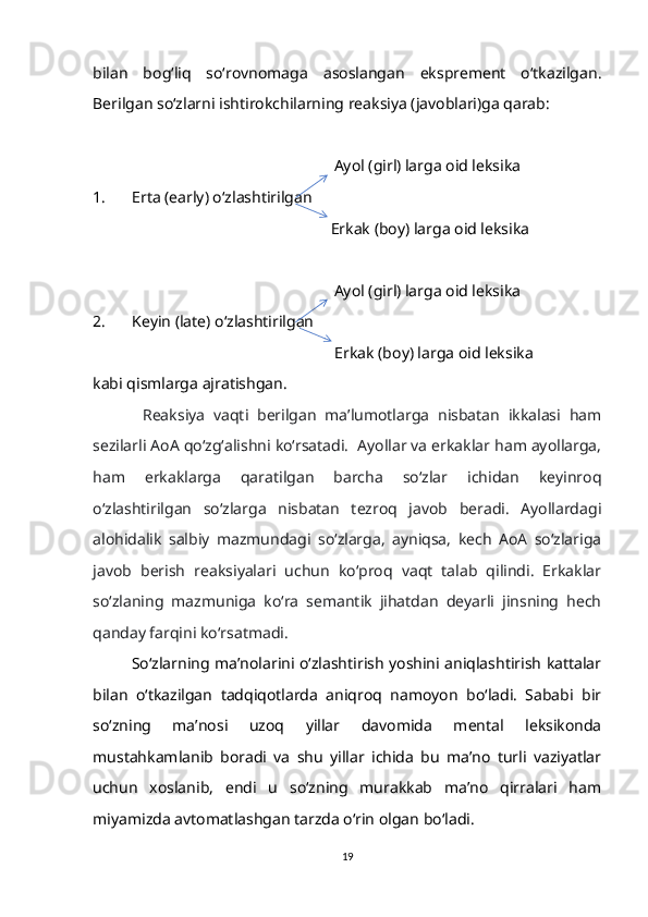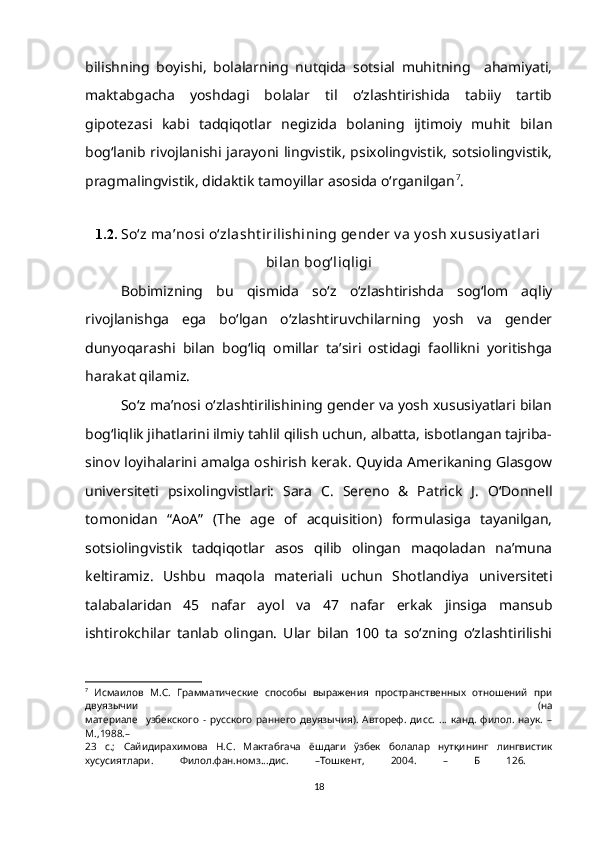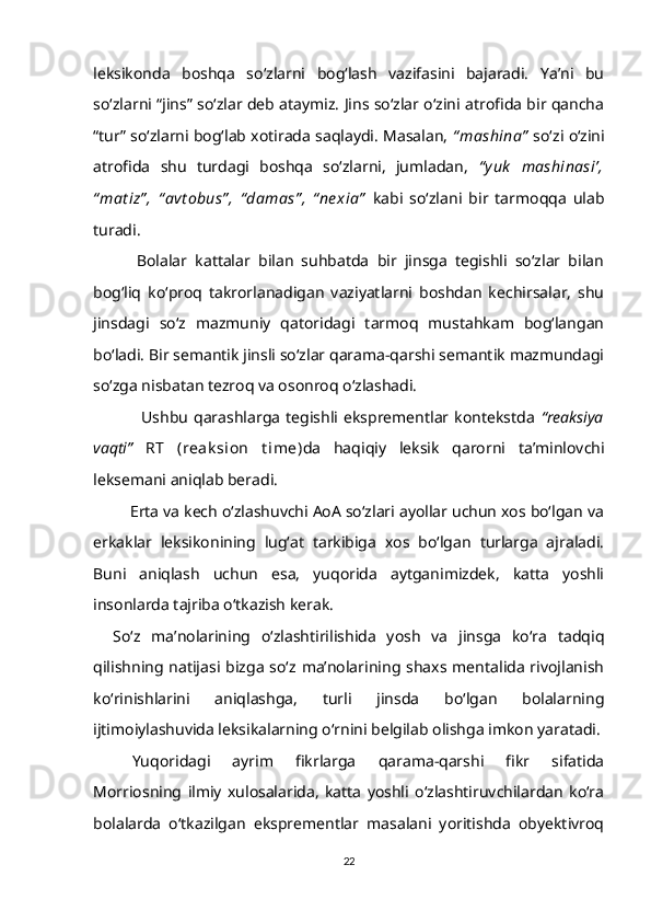1.2. So‘z ma’nosi o‘zlashtirilishining gender va yosh xususiyatlari bilan bog‘liqligi……………………………………………………………………….15