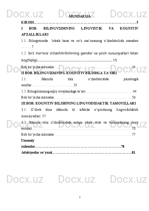 2.2. Bilingvizmning aqliy rivojlanishga ta’siri. …………………………………44