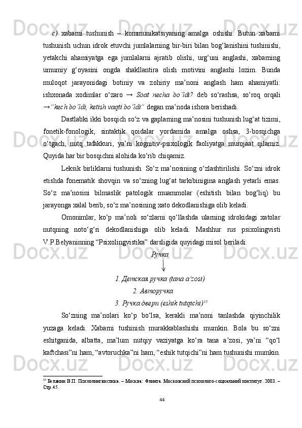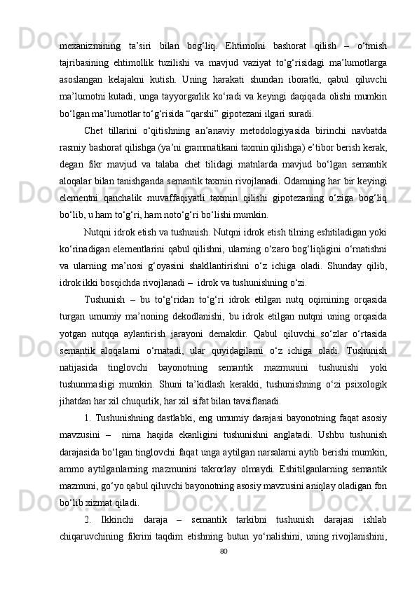 3.2. Ikkinchi tilni o‘zlashtirishda nutqni idrok etish va tushunishning ilmiy asoslari…………………………………………………………………………..70