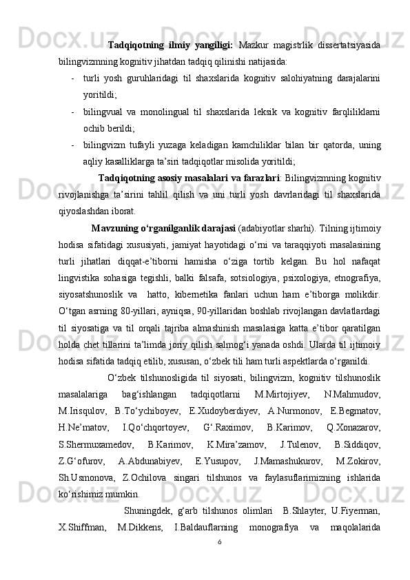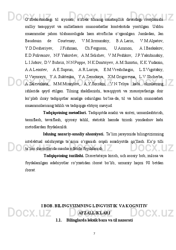 1.1. Bilingvizmda leksik baza va so‘z ma’nosining o‘zlashtirilishi masalasi ………7