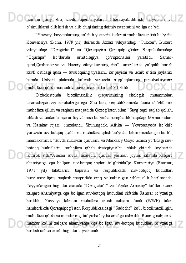 Konvensiya   (Bonn,   1979   yil)   doirasida   Jizzax   viloyatidagi   “Tuzkon”,   Buxoro
