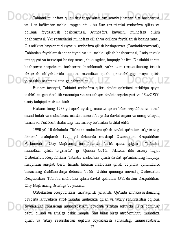 respublikasi “Tabiatni muxofaza qilish Davlat Qo’mitasi”.....................................27