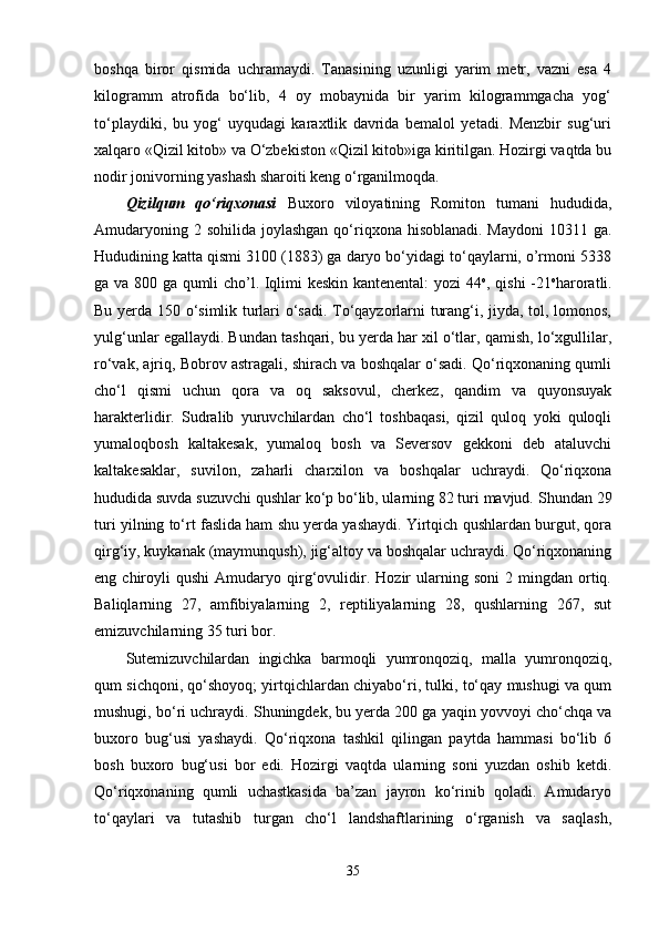 o‘simlik turi o‘sadi. O’simliklarning 266, qushlarning 172, baliqlarning 8 turi bor.