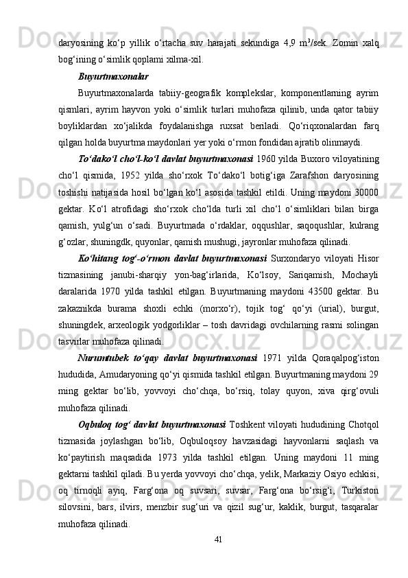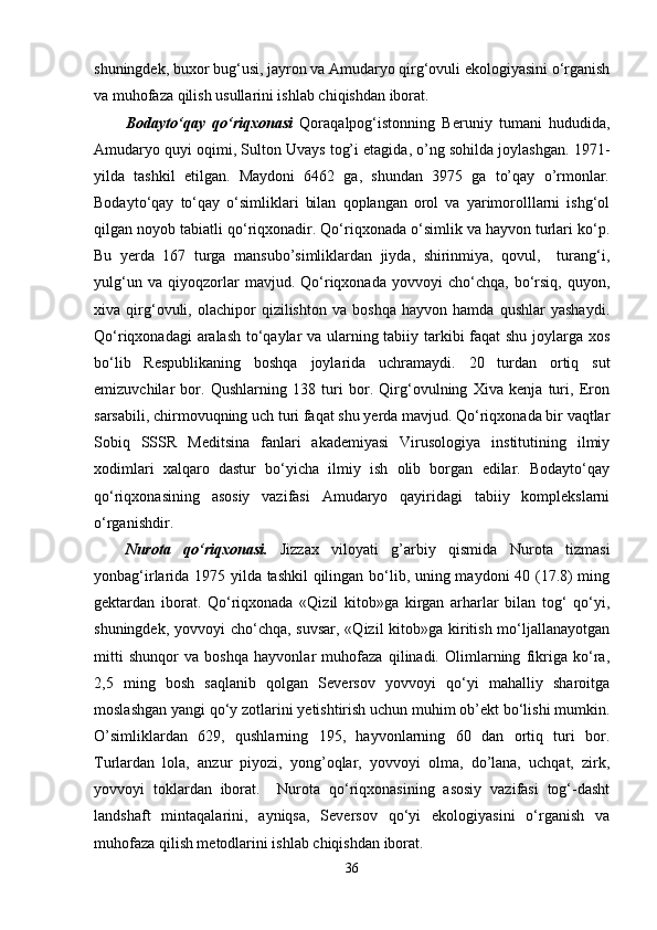 qo’riqxonalari. Milliy bog’lar. Davlat buyurtmaxonalari...................................... ..32