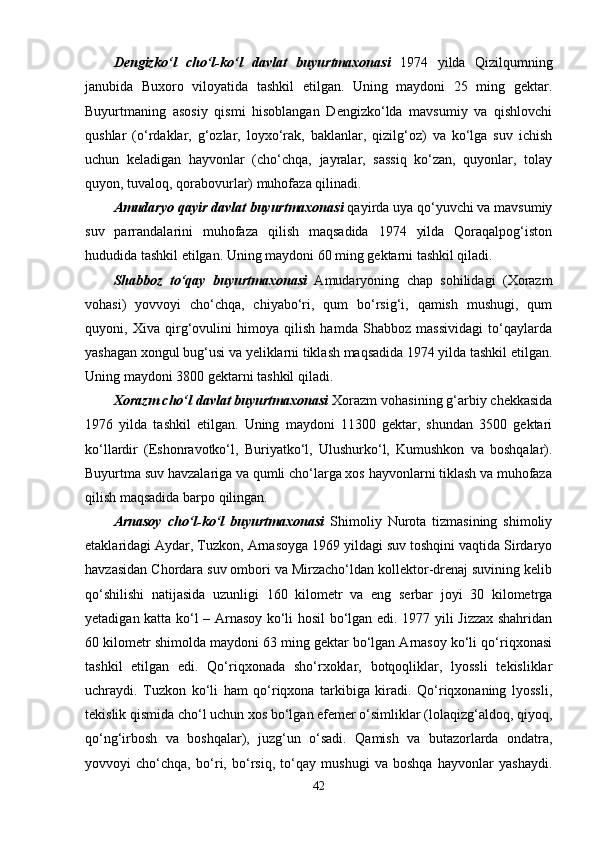 tashkil   etilgan   edi.   Qo‘riqxonada   sho‘rxoklar,   botqoqliklar,   lyossli   tekisliklar