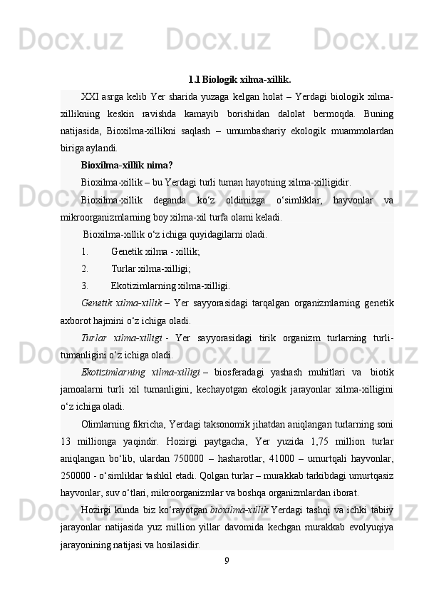 1.1 Biologik   xilma - xillik .....................................................................................10