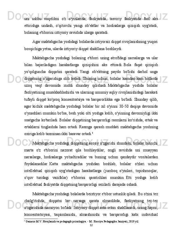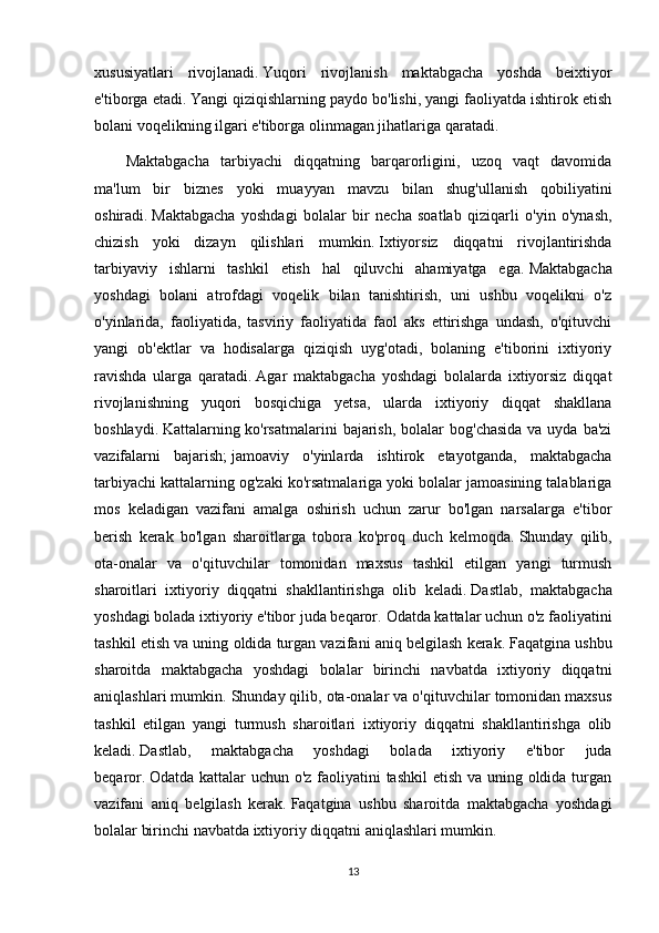 muvaffaqiyatini   belgilaydi.   Maktabgacha   tarbiyachida   beixtiyor   e'tibor   ustunlik