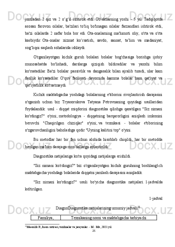 shahrining   3-sonli   MKDOU   d/s   bazasida   o'tkazildi.   Tadqiqotda   4   nafar   bola,