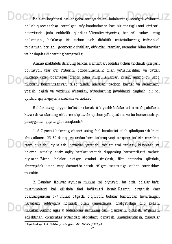 Lyublinskaya A.A. Bolalar psixologiyasi. -M.: Ma'rifat, 2022 yil.