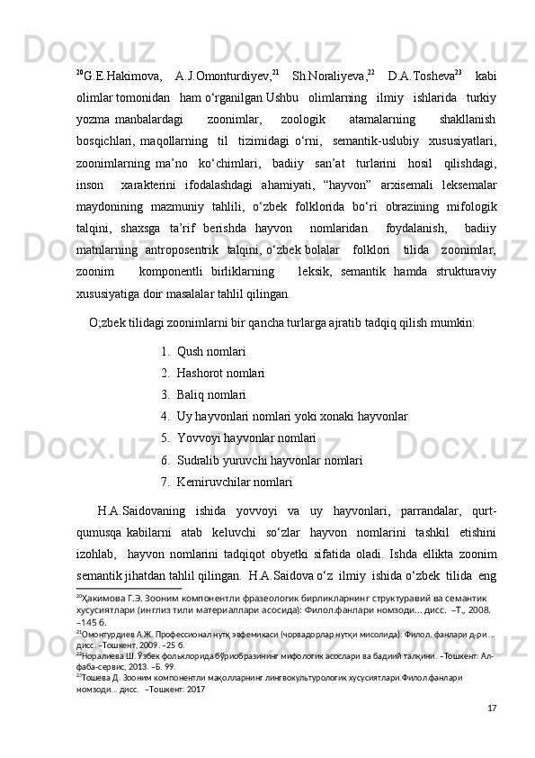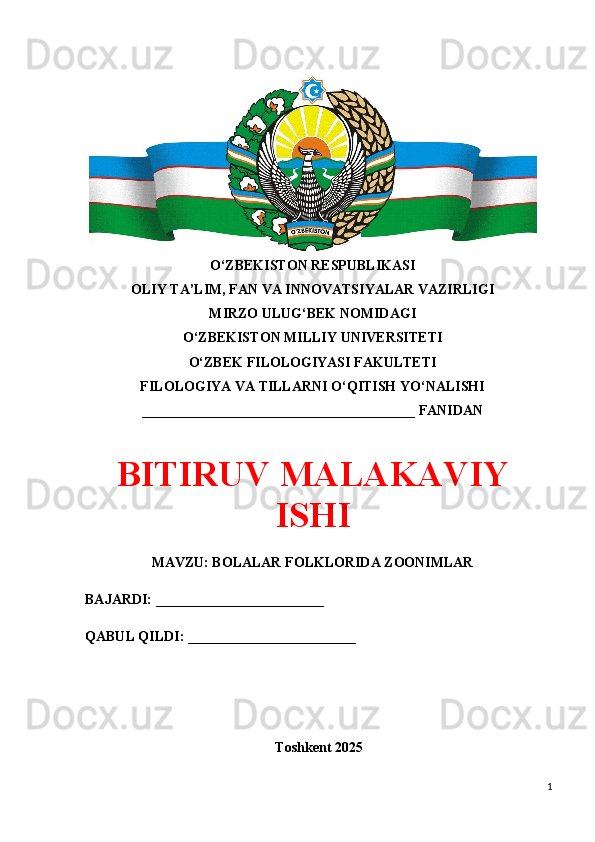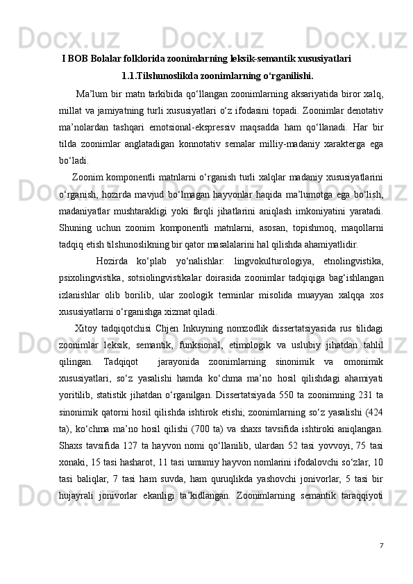 I BOB Bolalar folklorida zoonimlarning leksik-semantik xususiyatlari