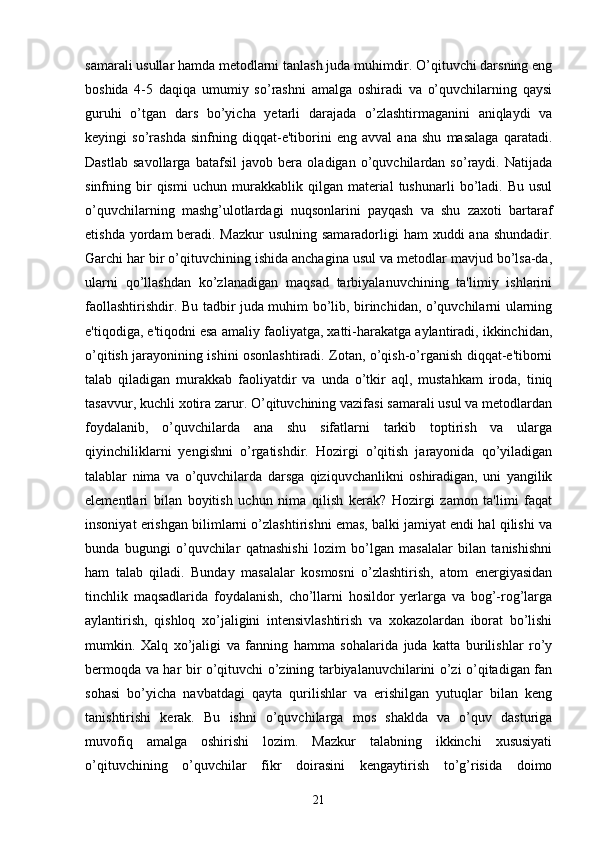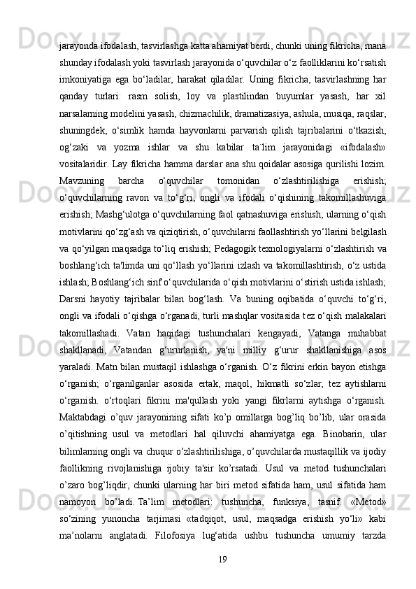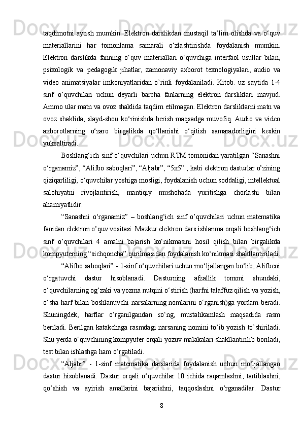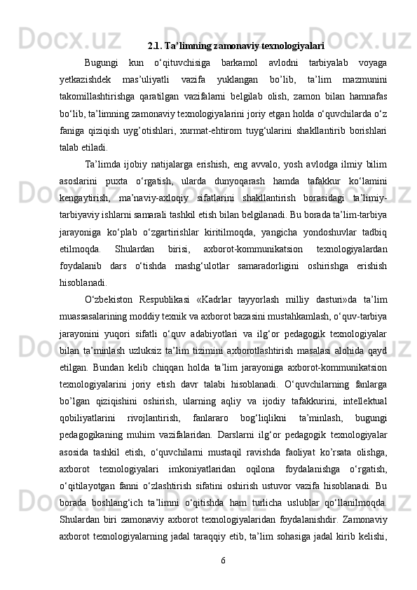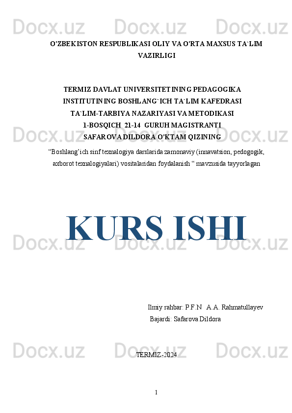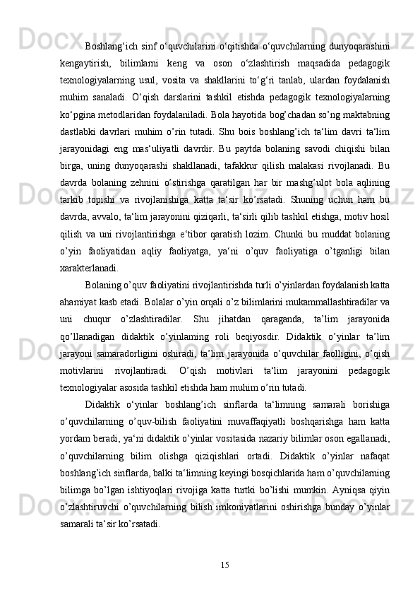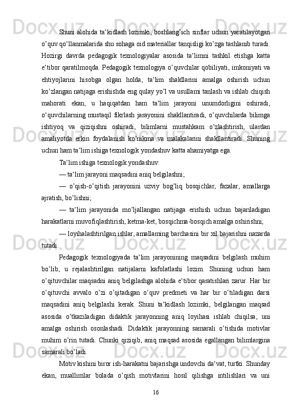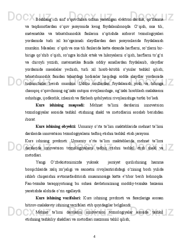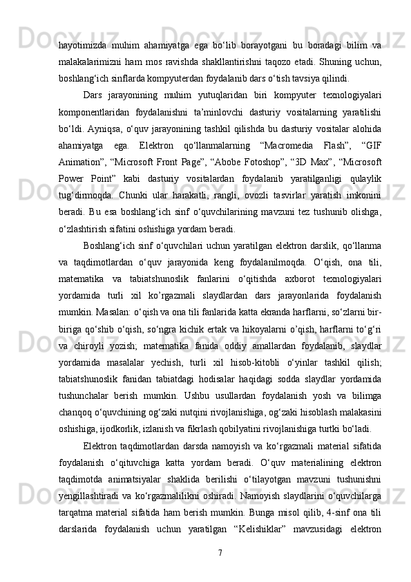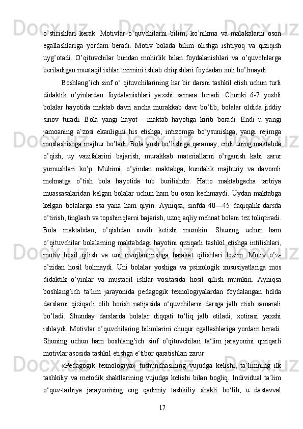 Boshlang’ich sinf texnologiya darslarida zamonaviy (innovatsion, pedagogik, axborot texnologiyalari) vositalaridan foydalanish