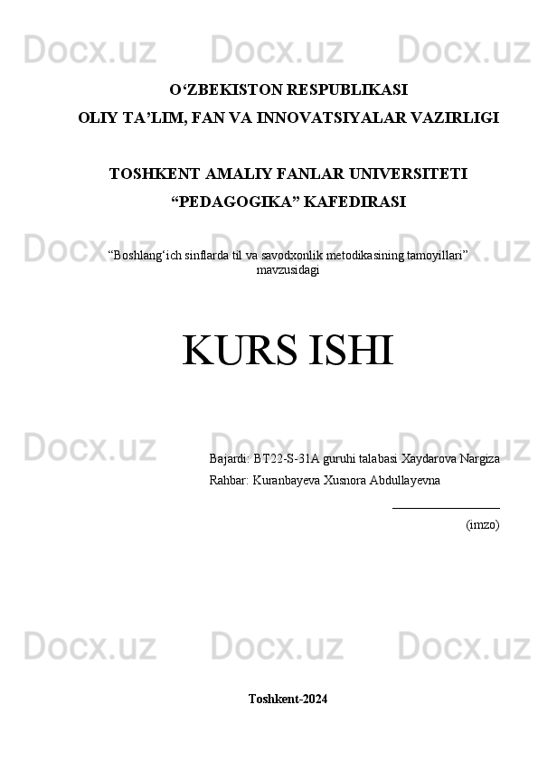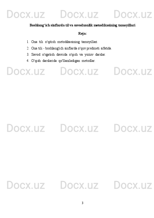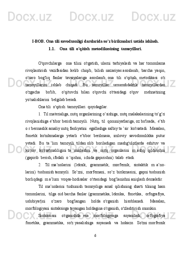 | 1.1.Ona tili o'qitish metodikasining tamoyillari......................................... | 6 |