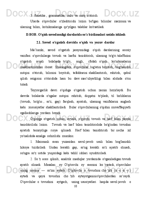 | I-BOB. Ona tili savodxonligi darslarida so’z birikmalari ustida ishlash | |