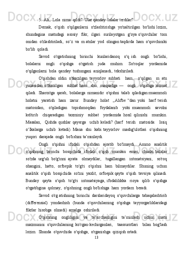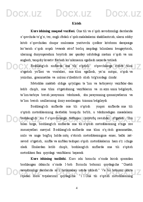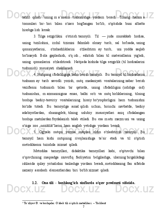 | 1.2. Ona tili - boshlang'ich sinflarda o'quv predmeti sifatida……....……..... | 7 |