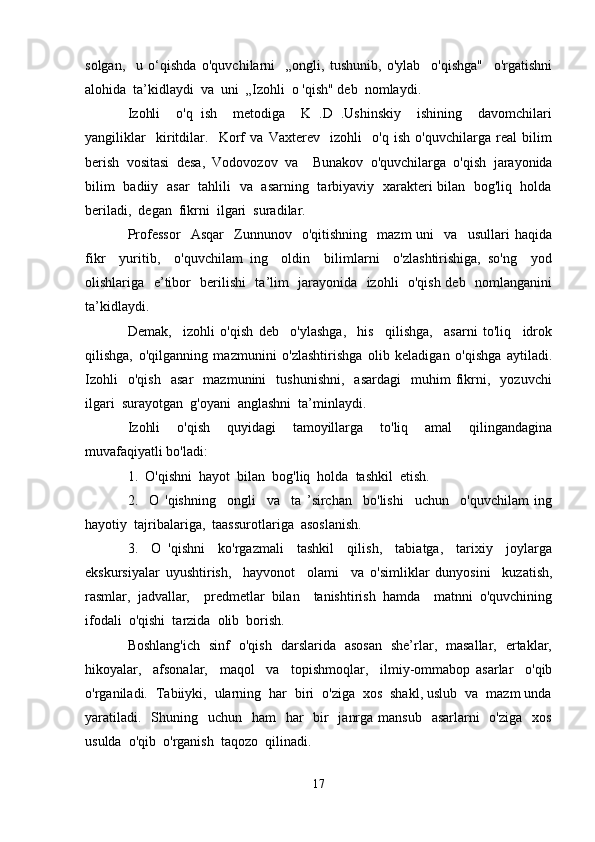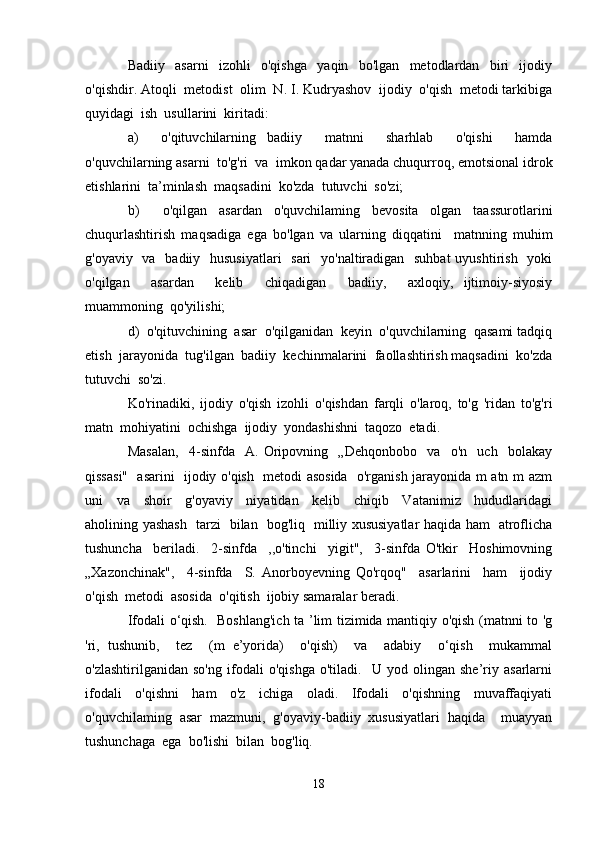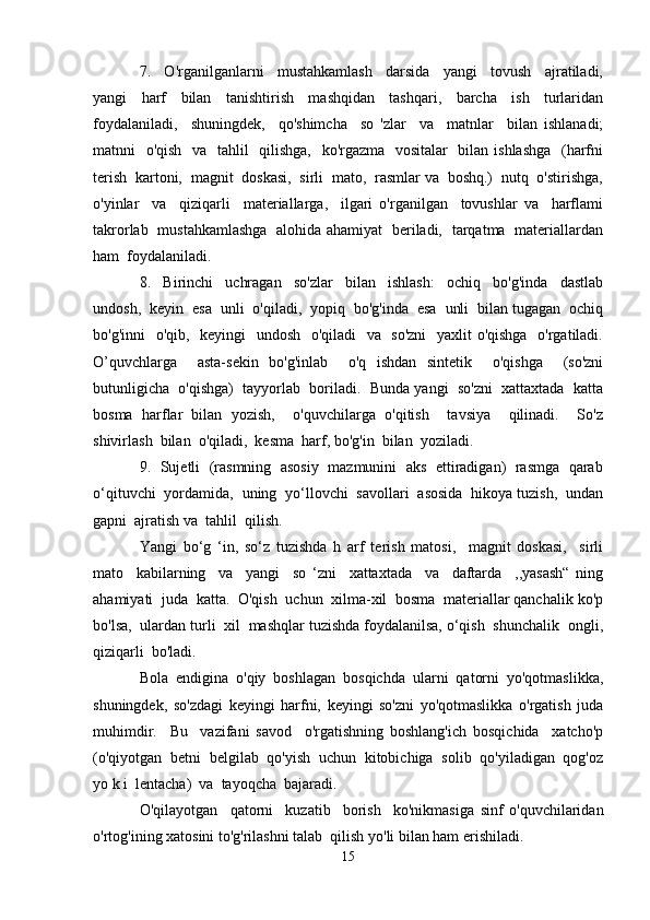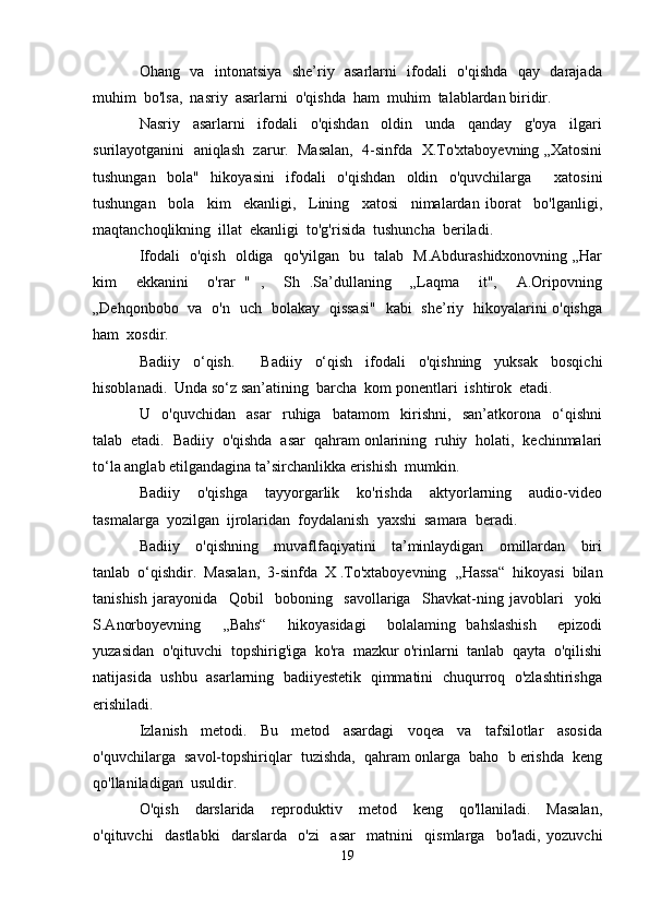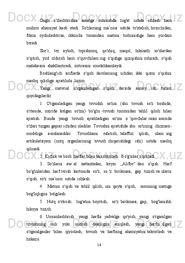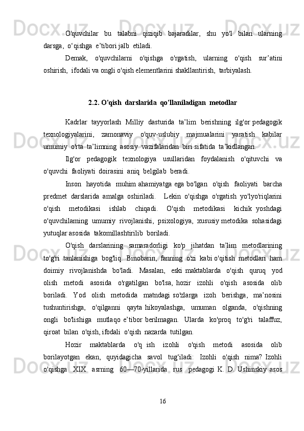 | 2.2. O'qish darslarida qo'llaniladigan metodlar……………………………. | 16 |