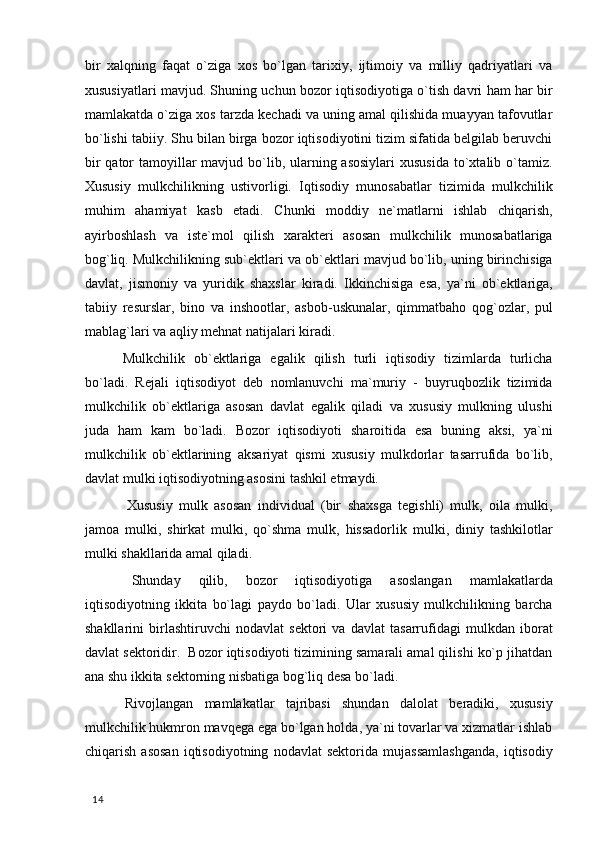 iqtisodiyoti   sharoitida   erkin   kechadi.   Xususiy   mulkchilik   bu   tizimning   asosini
