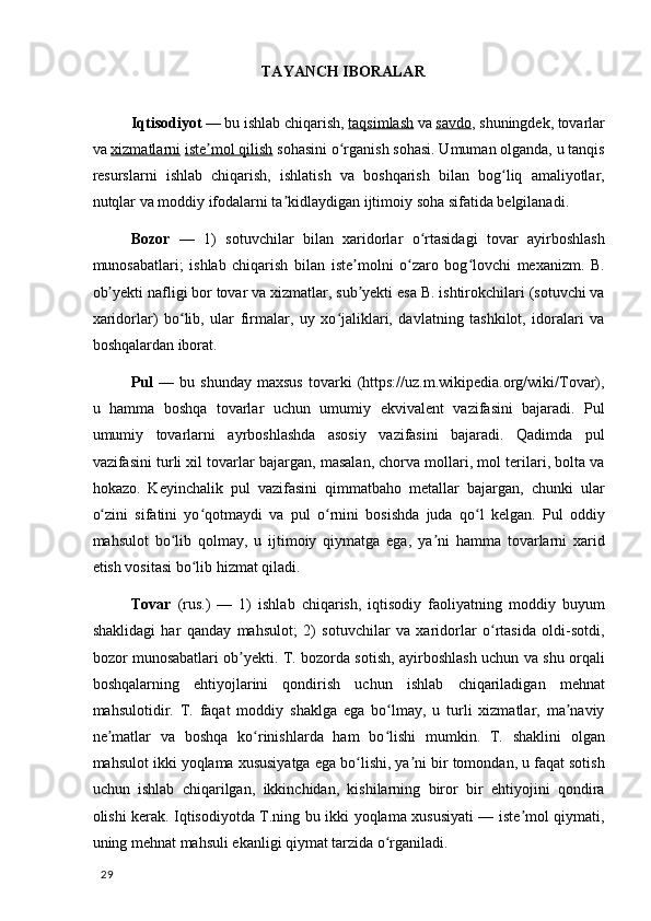 ayirboshlash   va   ularni   iste`mol   etishga   qaratilgan   iqtisodiy   faoliyat   bozor