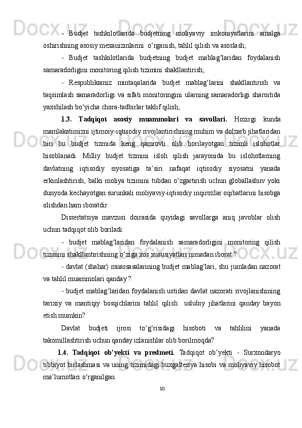 | 1.3. | Tadqiqotning asosiy muammolari va savollari...................................... | 11 | |