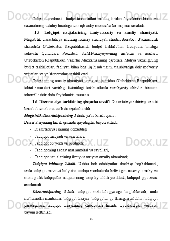 | 1.5. | Tadqiqot natijalarining ilmiy-nazariy va amaliy ahamiyati................... | 12 | |