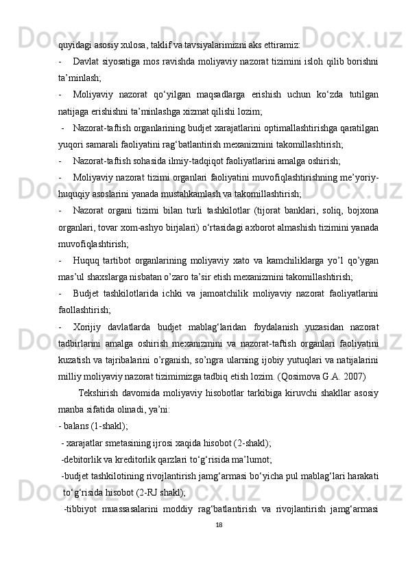 | 2.2. | Budjet tashkilotlari budget mablag‘laridan foydalanish hisobi nazorat tiziminini nazariy asoslari………..…………………………............... | 18 | |