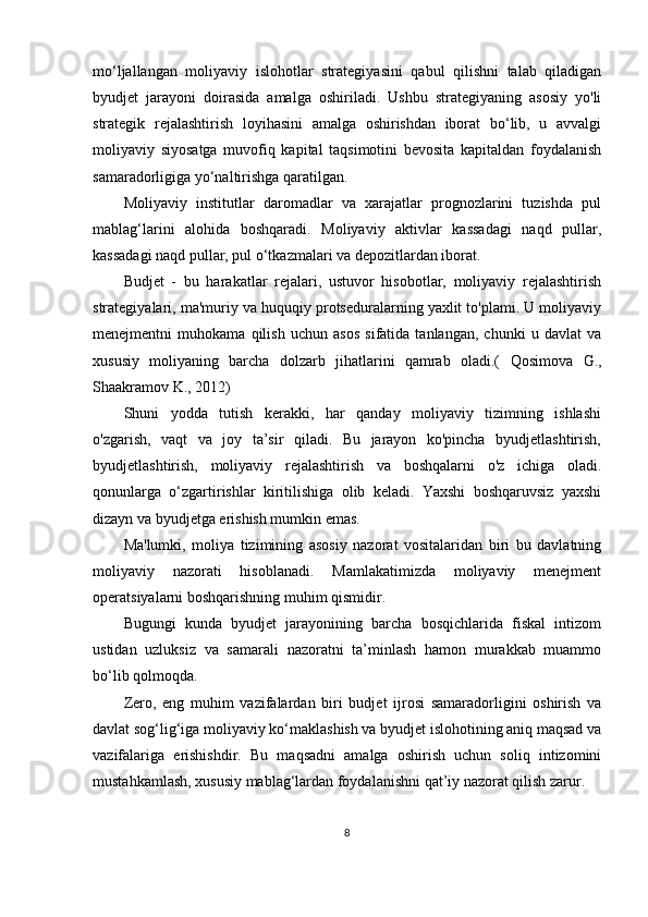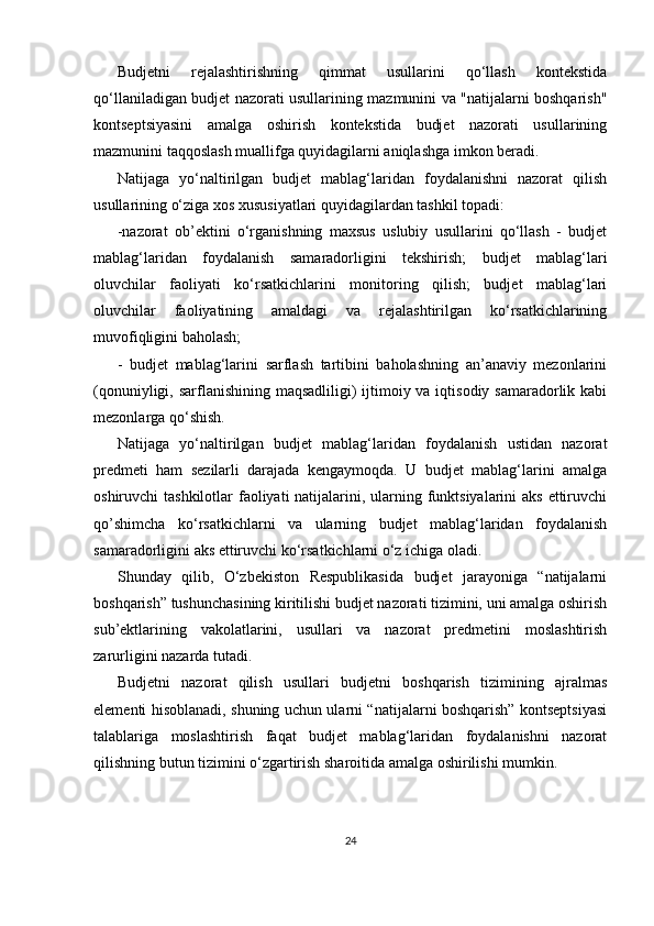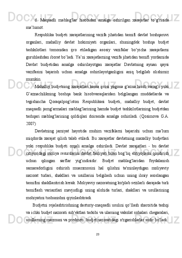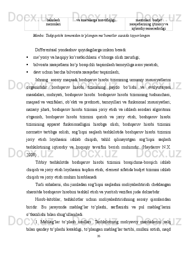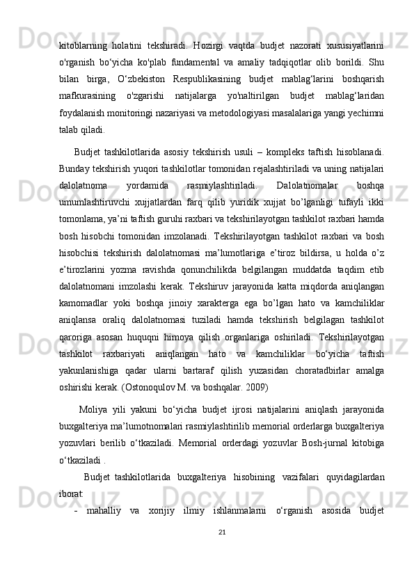 | 4.1. | Budjet tashkilotlari mablag‘laridan foydalanish hisobi va nazoratining o‘ziga xos xususiyatlari……............................................. | 34 | |