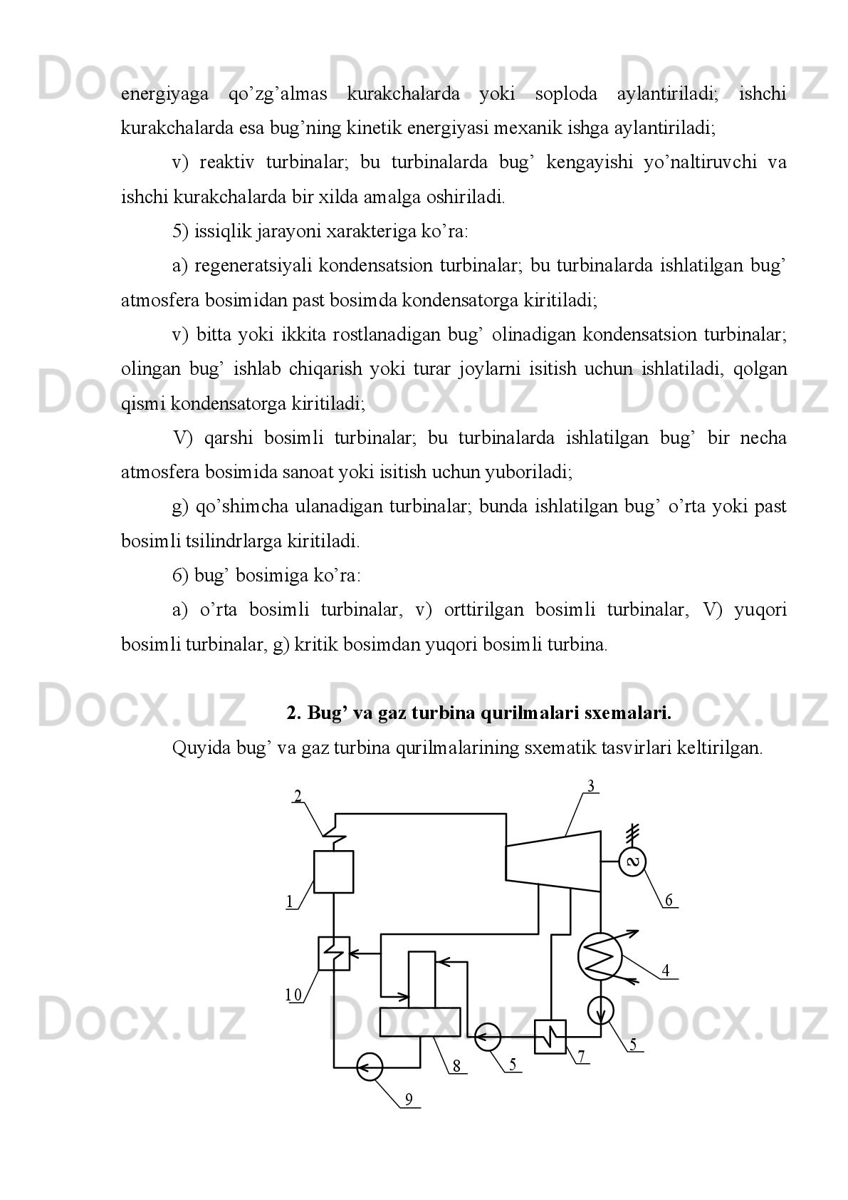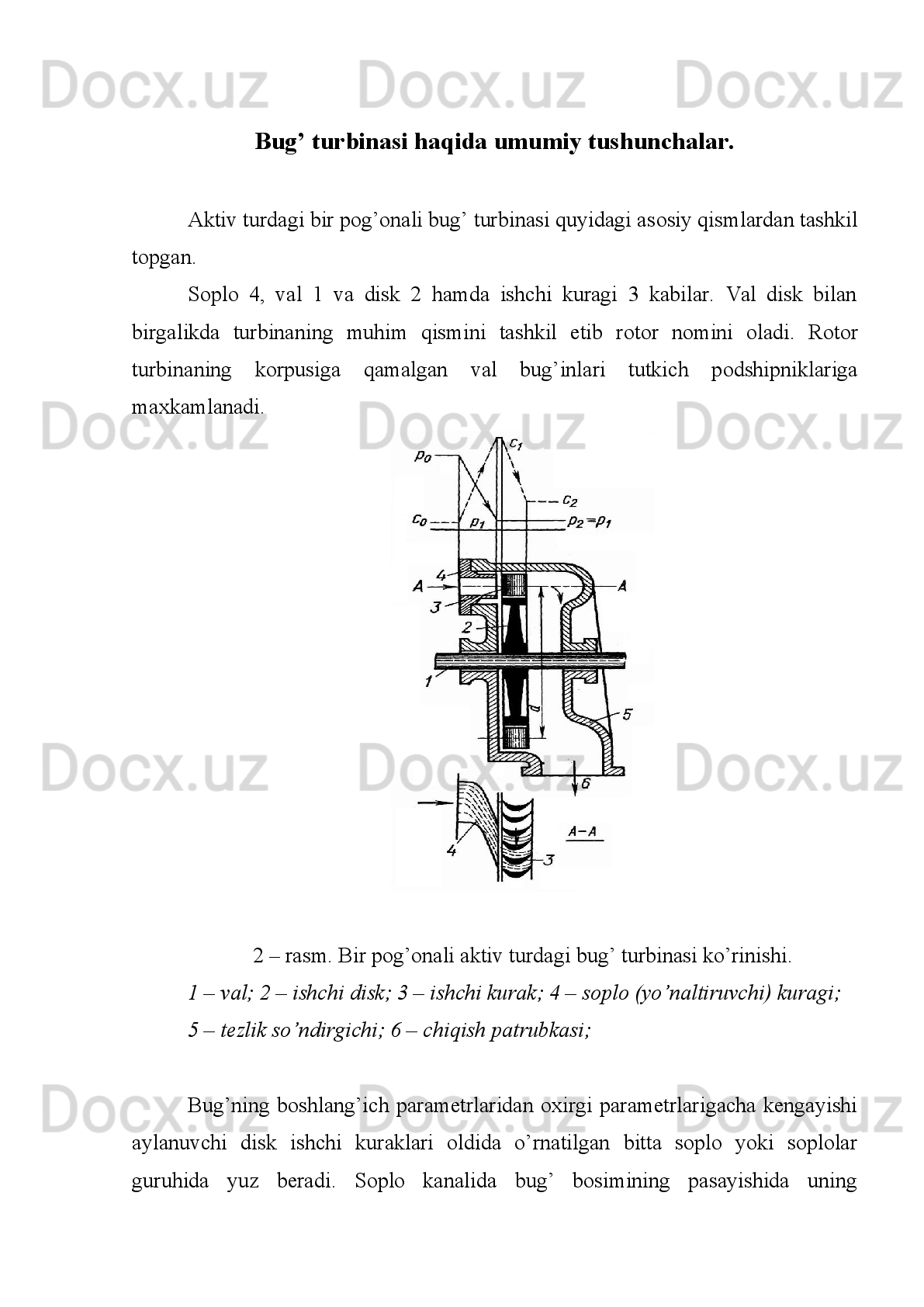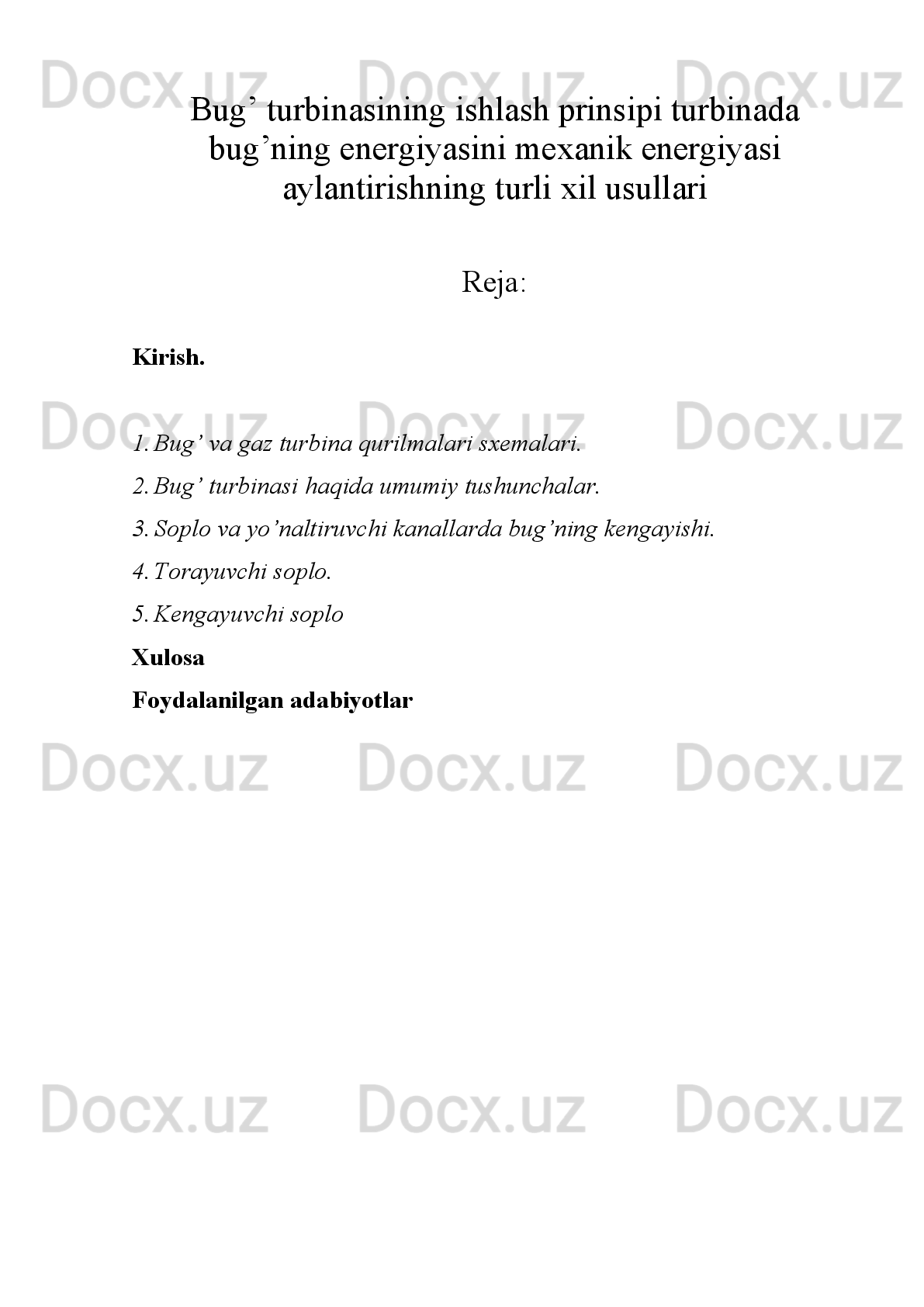 Bug’ turbinasining ishlash prinsipi turbinada bug’ning energiyasini mexanik energiyasi aylantirishning turli xil usullari