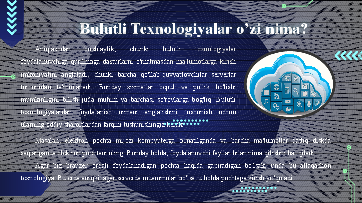 Bakalavr va magistrlar uchun. Iqtisod fakulteti talabalari uchun “Raqamli iqtisodiyot” fanidan “Bulutli texnologiyalar” mavzusida taqdimot