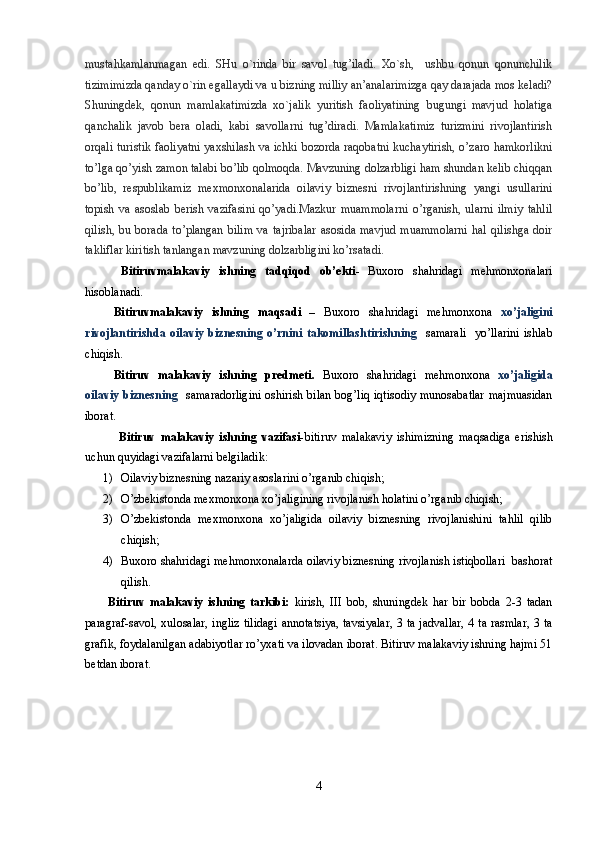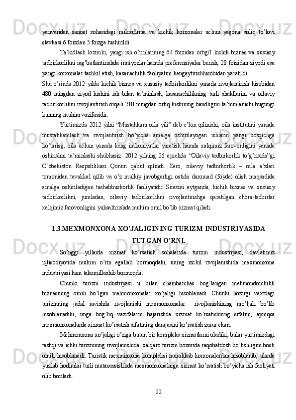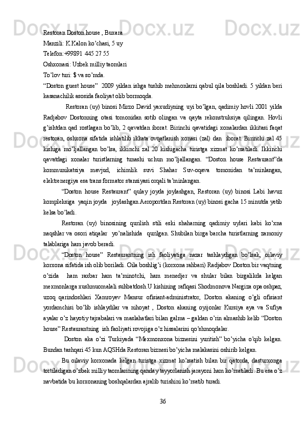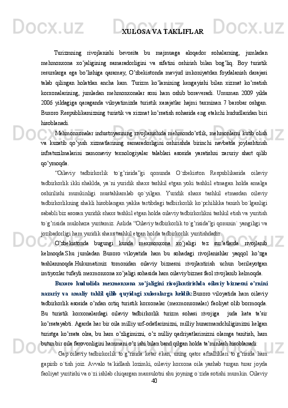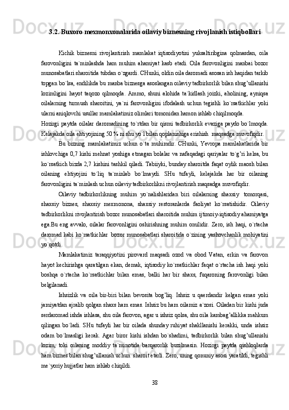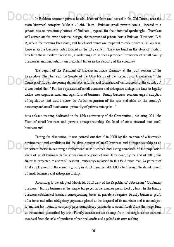 Buxoro hududida mexmonxona xo’jaligini rivojlantirishda oilaviy biznesni o’rni
