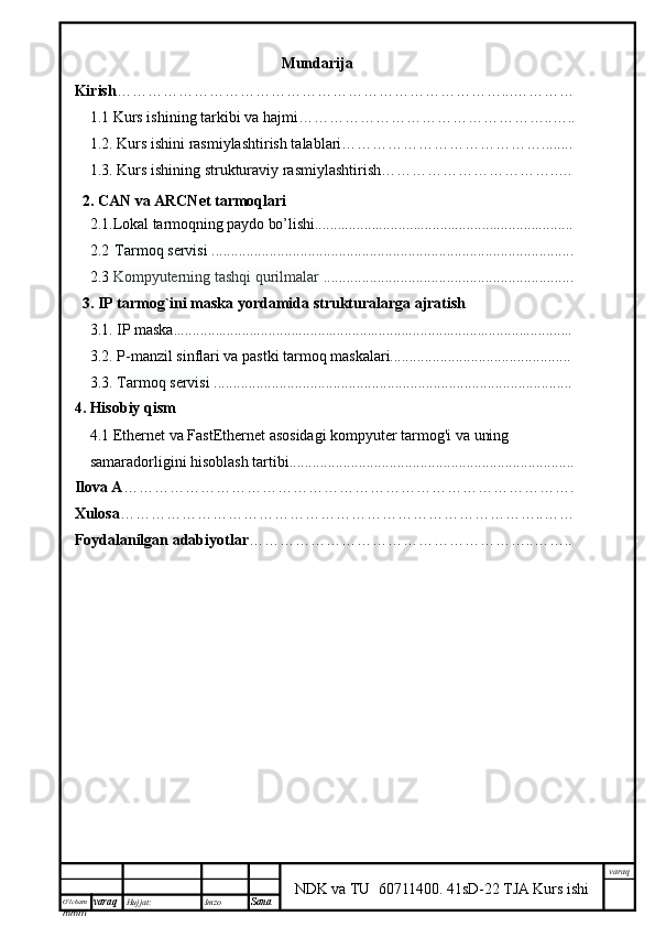 | 1.1 Kurs ishining tarkibi va hajmi…………………………………………..….. |